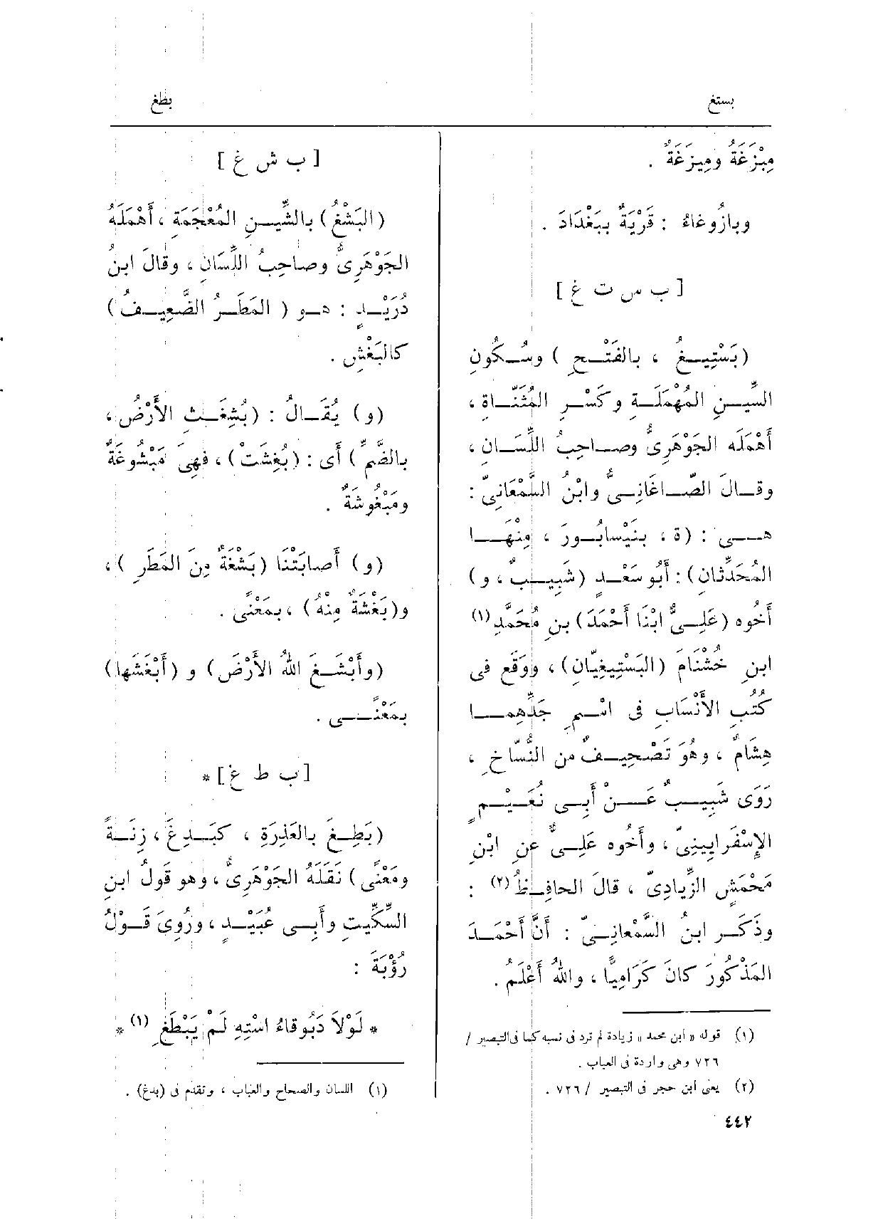 بَسْتِيغُ، بالفَتْحِ وسُكُونِ السِّينِ المُهْمَلَةِ وكَسْرِ المُثَنّاةِ، أهْمَلَهُ الجَوْهَرِيُّ وصاحِبُ اللِّسانِ، وقالَ الصّاغَانِيُّ وابنُ السَّمْعَانِيّ: هِيَ: ة، بنَيْسابُورَ، مِنْهَا المُحَدِثانِ: أَبُو سَعْدٍ شَبِيبٌ، وأخُوه عليٌّ ابنَا أحْمَدَ بنِ مُحَمَّدِ بنِ خُشْنَامَ البَسْتِيِغّانِ، ووقَعَ فِي كُتُبِ الأنْسَابِ فِي اسْمِ جَدِّهِما هِشَامٌ، وهُوَ تَصْحِيفٌ من النُّسّاخِ، رَوَى شَبيبٌ عنْ أبي نُعَيمٍ الإسْفَرايِيينّي، وأخُوه عليٌّ عَن ابنِ مَحْمَشٍ الزِّيادِيّ، قالَ الحافِظُ: وذكَر ابنُ السَّمْعَانِيّ: أنَّ أحمَدَ المَذْكُورَ كانَ كَرَامِيّاً، واللهُ أعلَمُ.