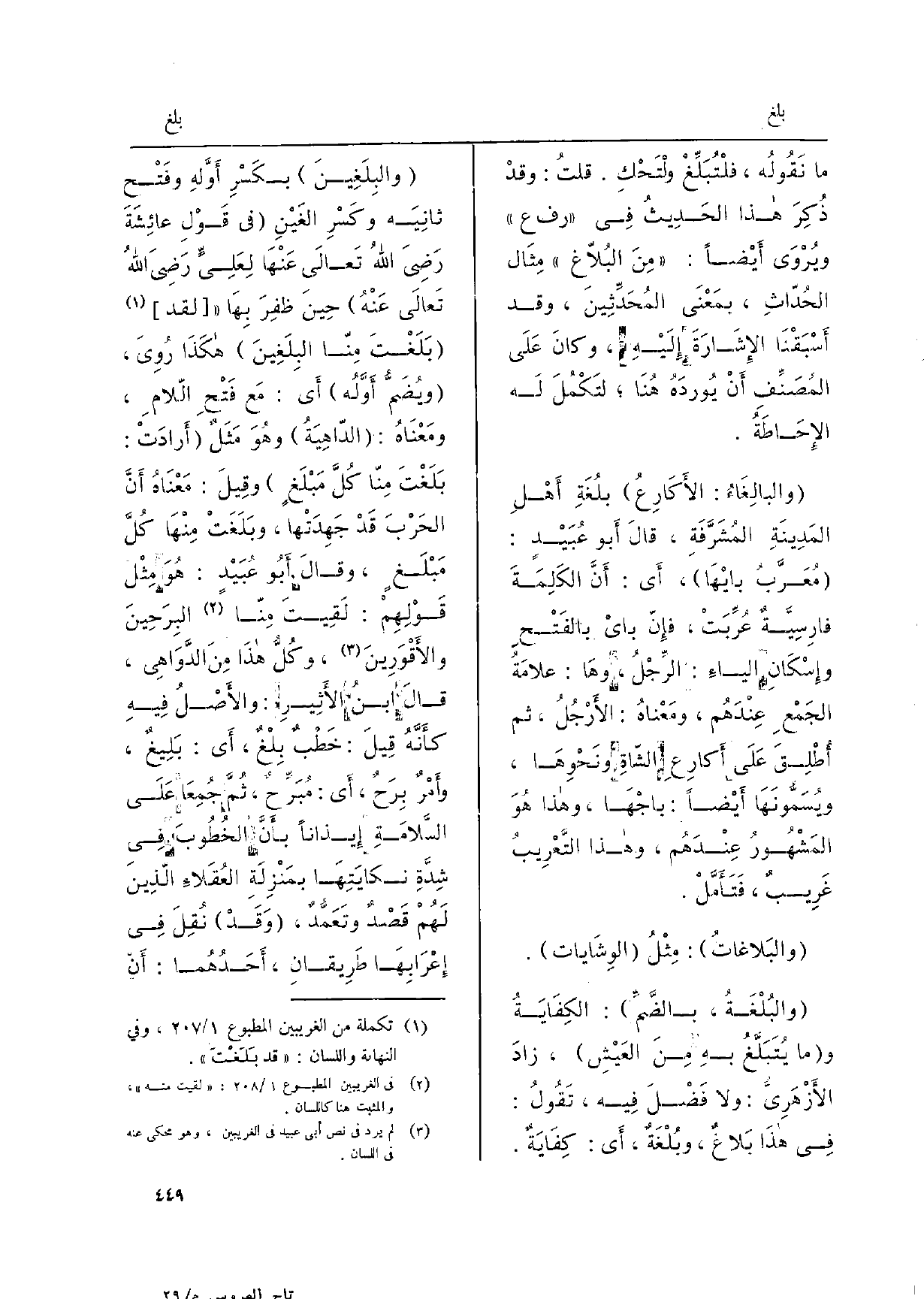 والبِلَغِينَ بكَسْرِ أوَّلهِ وفَتْحِ ثانِيَه وكَسْرِ الغَيْنِ فِي قَوْلِ عائِشَةَ رَضِي اللهُ تَعَالَى عَنْهَا لعَلِيٍّ رَضِي الله عَنهُ حينَ ظفِرَ بهَا لقد بَلَغْتَ مِنّا البِلَغِينَ هَكَذَا رُوِيَ، ويُضَمُّ أوَّلُه أَي: مَعَ فَتْحِ اللامِ، ومَعْنَاهُ الدّاهِيَةُ وهُوَ مَثَلٌ أرادَتْ: بَلَغْتَ مِنّا كُلَّ مَبْلَغٍ، وقيلَ: مَعْنَاهُ أنَّ الحَرْبَ قدْ جَهِدَتْها، وبَلَغَتْ منْهَا كُلَّ مَبْلَغٍ، وقالَ أَبُو عُبَيْدٍ: هُوَ مَثْلُ قَوْلِهِمْ: لَقِيتَ مِنّا البِرَحِينَ والأقْوَرِينَ وكُلُّ هَذَا من الدَّوَاهِي، قالَ ابنُ الأثِيرِ: والأصْلُ فيهِ كأنَّهُ قيلَ: خَطْبٌ بِلْغٌ، أَي: بَلِيغٌ، وأمْرٌ بِرَحٌ، أَي: مُبَرِّحٌ، ثُمَّ جُمِعَا على السَّلامَةِ إِيذَانًا بأنَّ الخُطُوبَ فِي شِدَّةِ نكايَتِهَا بمَنْزِلَةِ العُقَلاءِ الذينَ لَهُمْ قَصْدٌ وتَعَمُّدٌ، وقَدْ نُقِلَ فِي إعْرَابِهَا طَرِيقانِ، أحَدُهُما: أنْ