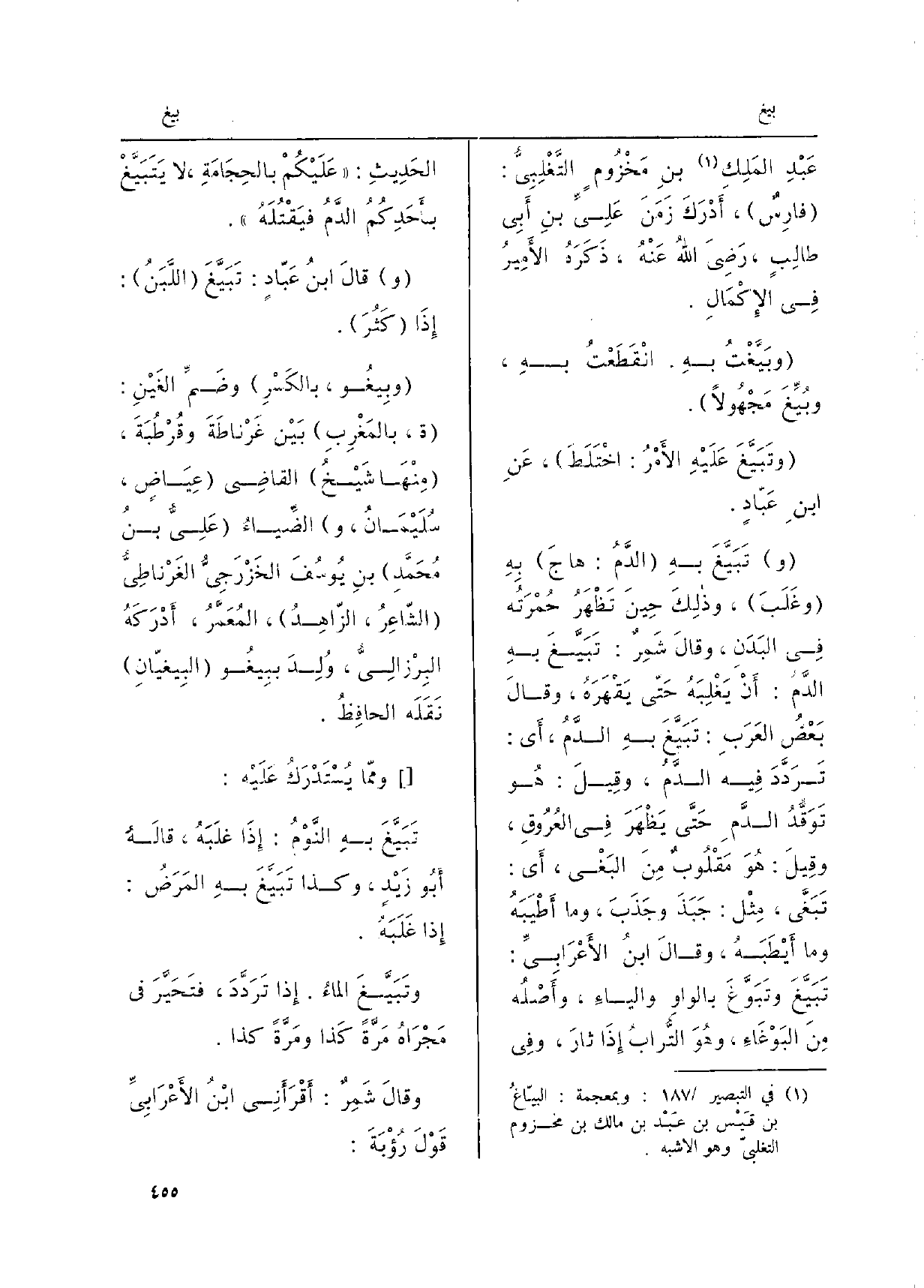 (و) } تَبَيَّغَ بهِ الدَّمُ: هاجَ بهِ وغَلَبَ، وَذَلِكَ حينَ تَظْهَرُ حُمْرَتُه فِي البَدَنِ، وقالَ شَمِرٌ: {تَبَيَّغَ بهِ الدَّمُ: أنْ يَغْلِبَهُ حَتَّى يَقْهَرَهُ، وقالَ بَعْضُ العَرَبِ:} تَبَيَّغَ بهِ الدَّمُ، أَي: تَرَدَّدَ فِيهِ الدَّمُ، وقيلَ: هُو تَوَقُّدُ الدَّمِ وقيلَ: هُوَ تَوَقُّدُ الدَّمِ حَتَّى يَظْهَرَ فِي العُرُوقِ، وقيلَ: هُوَ مَقْلُوبٌ منَ البَغْي، أَي: تَبَغَّى مِثل: جَبَذَ وجَذَبَ، وَمَا أطْيَبَهُ وَمَا أيْطَبَهُ، وقالَ ابنُ الأعْرَابِيّ: تَبَيَّغَ وتَبَوَّغَ بالواوِ والياءِ، وأصْلُه منَ البَوْغَاءِ، وهُوَ التُّرابُ إِذا ثارَ، وَفِي الحديثِ: عَلَيْكُمْ بالحِجَامَةِ، لَا {يَتَبَيَّغْ بأحَدِكُمُ الدَّمُ فيَقْتُلُه.