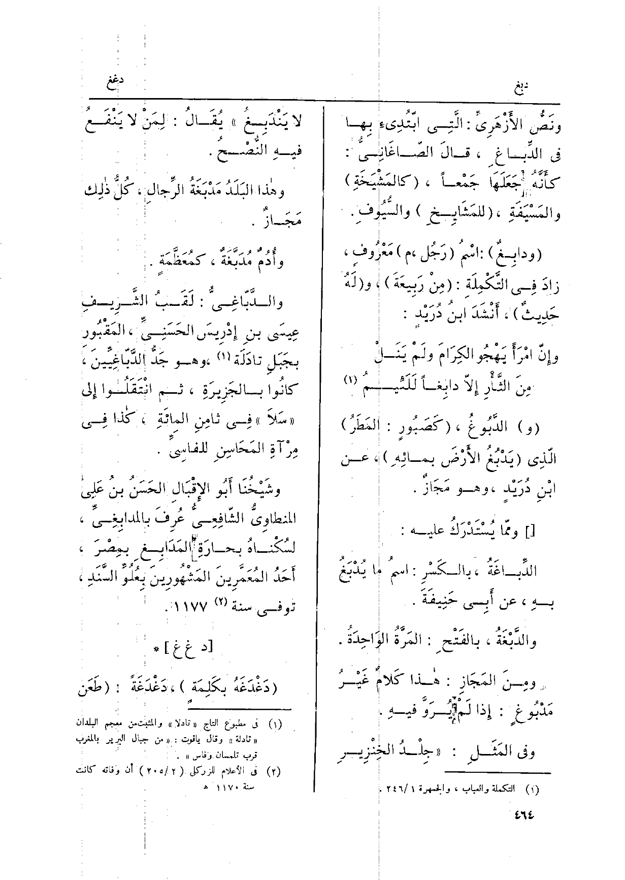 والدَّبّاغِيُّ: لَقَبُ الشَّرِيفِ عيسَى بنِ إدْرِيسَ الحَسَنِيِّ، المَقْبُورِ بجَبَلِ تادَلَة، وَهُوَ جَدُّ الدَّبّاغِينَ، كانُوا بالجَزِيرَةِ، ثمَّ انْتَقَلُوا إِلَى سَلا فِي ثامِنِ المائَةِ، كَذَا فِي مِرْآةِ المَحَاسِنِ للفاسِيِّ.