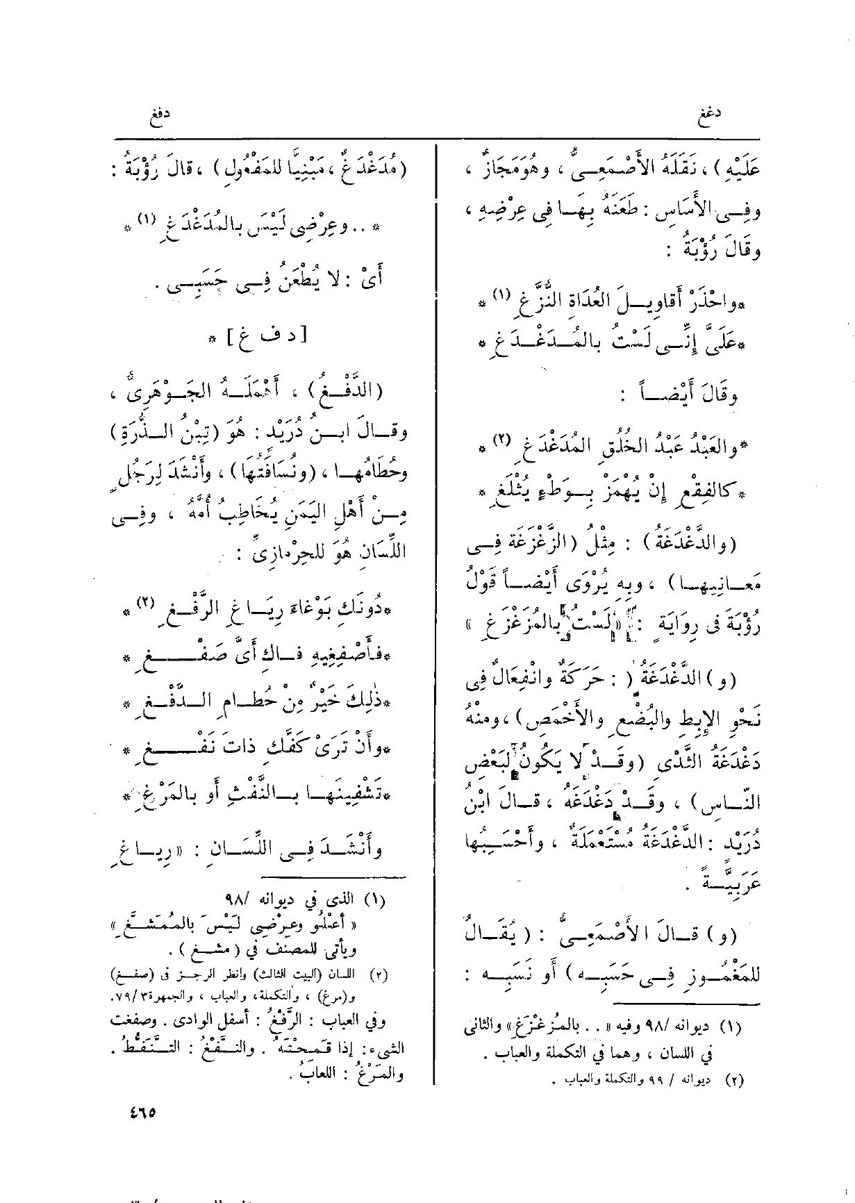 عليْهِ، نَقَلَه الأصْمَعِيُّ وهوَ مجازٌ، وَفِي الأساسِ: طَعَنَهُ بهَا فِي عِرْضِهِ، وقالَ رُؤْبَةُ: واحْذَرْ أقاوِيلَ العُدَاةِ النُّزَّعِ عليَّ إنِّي لَسْتُ {بالمُدَغْدَغِ وقالَ أيْضاً: والعَبْدُ عَبْدُ الخُلُقِ} المُدَغْدَغِ كالفِقْعِ إنْ يُهْمَزْ بوَطْءٍ يُثْلَغِ {والدَّغْدَغَةُ: مِثْلُ الزَّغْزَغَة فِي مَعَانِيهَا، وبهِ يُرْوَى أيْضاً قَوْلُ رُؤْبَةَ فِي رِوايةٍ: لَسْتُ بالمُزَغْزَغِ.