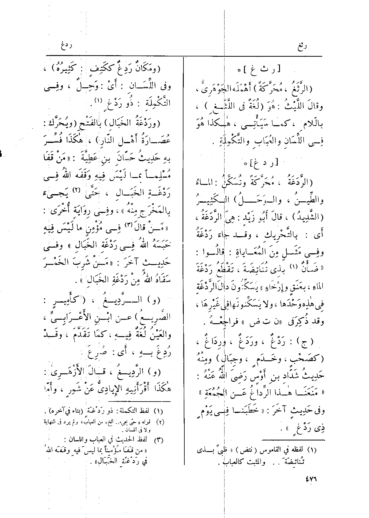 الرَّدَغَةُ، مُحَرَّكَةً وتُسَكَّنُ: الماءُ والطِّيْنُ، والوَحَلُ الكَثِيرُ الشَّديدُ، قالَ أَبُو زَيْدٍ: هِيَ الرَّدَغَةُ، أَي: بالتَّحْرِيكِ وَقد جاءَ رَدْغَةُ أَي: بالتَّحْرِيكِ، وَقد جاءَ رَدْغَةُ، وَفِي مَثَلٍِ منَ المُعَاياةِ: قالُوا: ضَأْنٌ بِذِي تُنَاتِضَةَ تَقْطَعُ رَدْغَةَ الماءِ، بعَنَقٍ وإرْخَاءٍ يُسَكّنُونَ دالَ الرَّدْغَةِ فِي هَذِه وَحْدَها، وَلَا يُسَكِّنُونَها فِي غَيْرِهَا، وَقد ذُكِرَ فِي نتض فراجِعْهُ. ج: رَدْغٌ ورَدَغٌ، ورِدَاغٌ، كصَحْبٍ، وخَدَمٍ، وجِبَالٍ، وَمِنْه حديثُ شَدّاد بنِ أوْسٍ رَضِي الله عَنهُ: مَنَعَنَا هَذَا الرِّداغُ عَن الجُمُعَةِ، وَفِي حديثٍ آخَرَ: خَطَبنا فِي يَوْمٍ ذِي رَدْغٍ.