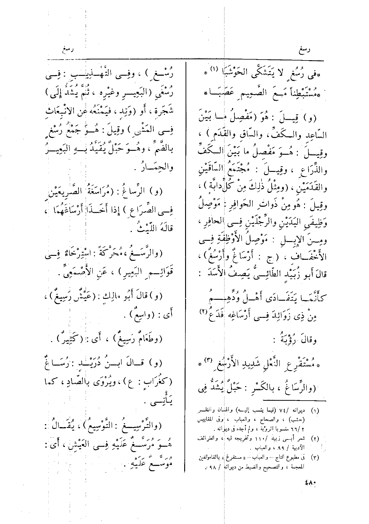 فِي رُسُغٍ لَا يَتَشَكَّى الحَوْشَبَا مُسْتَبْطِناً معَ الصَّمِيمِ عَصَبَا وقيلَ: هُوَ مِفْصِلُ مَا بَيْنَ السّاعِدِ والكَفِّ، والسّاقِ والقَدَمِ، وقيلَ: هُوَ مَفْصِلُ مَا بَيْنَ الكَفِّ والذِّرَاعِ، وقيلَ: مُجْتَمَعُ السّاقَيْنِ والقَدَمَيْنِ، ومثلُ ذلكَ منْ كُلِّ دابَّةٍ، وقيلَ: هُوَ من ذواتِ الحَوافِرِ: مَوْصِلُ وَظِيفَيِ اليَدَيْنِ والرِّجْلَيْنِ فِي الحافِرِ، ومنَ الإبِلِ: مَوْصِلُ الأوْظِفَةِ فِي الأخْفَافِ، ج: أرْسَاغٌ وأرْسُغٌ، قالَ أَبُو زُبَيْدٍ الطّائِيُّ يَصِفُ الأسَدَ: