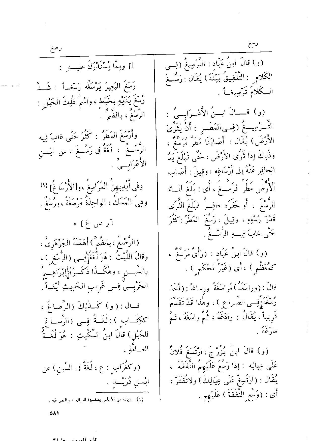 قالَ: وراسَغَهُ مُراسَغَةً ورِساغاً: أخَذ رُسْغَهُ فِي الصِّراعِ، وَهَذَا قَدْ تَقَدَّمَ قَرِيباً، يُقَالُ: رادَغَهُ ثمَّ راسغَهُ، ثمَّ مارَغَهُ.