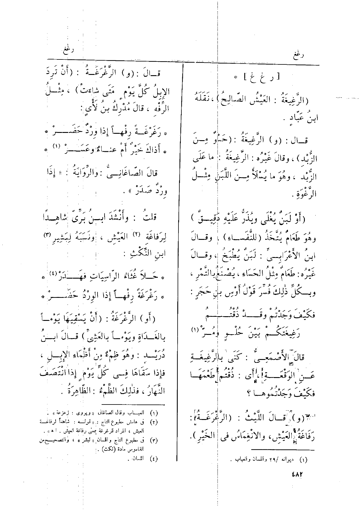 قالَ: والرَّغْرَغَةُ: أنْ تَرِدَ الإبِلُ كُلَّ يَوْمٍ مَتى شاءَتْ، مِثْلُ الرِّفْهِ، قالَ مُدْرِكُ بنُ لأْيٍ:! رَغَرْغَةً رِفْهاً إِذا وِرْدٌ حضَرْ أذاكَ خَيْرٌ أم عناءٌ وعَسَرْ قالَ الصّاغَانِيُّ: والرِّوايَةُ: إِذا وِرْدٌ صَدَرْ.