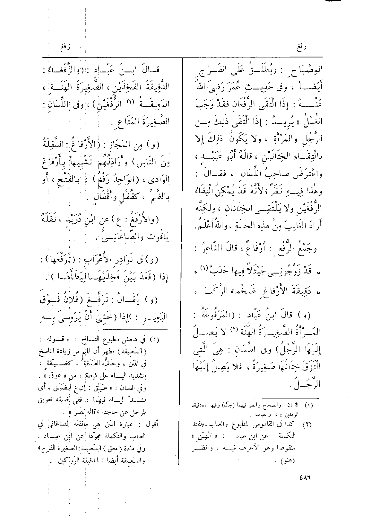 المِصْبَاحِ: ويُطْلَقُ على الفَرْجِ أيْضاً وَفِي حديثِ عُمَرَ رَضِي الله عَنهُ: إِذا الْتَقَى الرُّفْغَانِ فقَدْ وَجَبَ الغُسْلُ يُرِيدُ: إِذا الْتَقَى ذلكَ من الرَّجُلِ والمَرْأَةِ وَلَا يَكُونُ ذلكَ إِلَّا بالْتِقَاءِ الخِتَانَيْنِ، قالَهُ أَبُو عُبَيْدٍ، واعْتَرَضَ صاحِبُ اللِّسَانِ، فقالَ: وَهَذَا فيهِ نَظَرٌ، لأنَّهُ قدْ يُمْكِنُ الْتِقَاءُ الرُّفْغَيْنِ وَلَا يَلْتَقِي الخِتَانانِ، ولكنَّه أرادَ الغَالِبَ منْ هذهِ الحالَةِ، واللهُ أعْلَمُ.