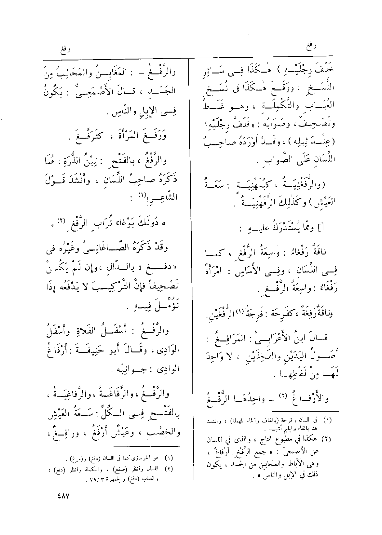 والرَّفْغُ: أسْفَلُ الفَلاةِ وأسْفَلُ الوَادِي، وقالَ أَبُو حَنِيفَةَ: أرْفَاغُ الوادِي: جوانِبُه.