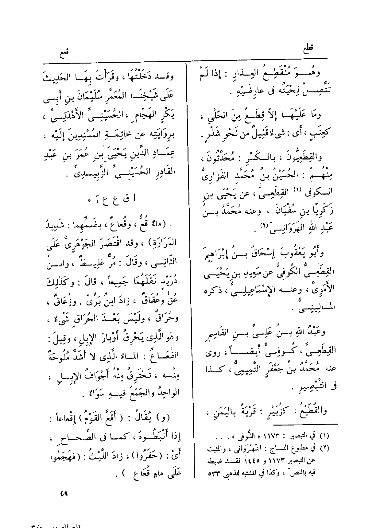 والقِطَعِيُّونَ، بالكَسْرِ: مُحَدِّثُونَ، مِنْهُم: الحُسَينُ بنُ مُحَمَّدِ الفَزارِيُّ الْكُوفِي القِطَعِيُّ، عَن يَحْيَى بنِ زَكَرِيّا بنِ سُفْيَان، وَعنهُ مُحَمَّدُ بنُ عَبْدِ اللهِ الهَرَوَانِيّ.)