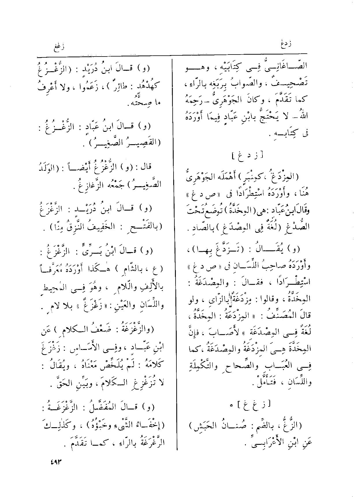 ويُقَالُ: تَزَدَّغَ بهَا، وأوْرَدَهُ صاحِبُ اللِّسانِ فِي صِدغ اسْتِطْراداً، فقالَ: والمِصْدَغَةُ: المِخَدَّةُ، وَقَالُوا: مِزْدَغَةٌ بالزّايِ، وَلَو قالَ المُصَنِّف: المِزْدَغَةُ: المِخَدَّةُ، لُغَةٌ فِي المِصْدَغَةِ لأصَابَ، فإنَّ المِخَدَّةَ هِيَ المِزْدَغَةُ والمِصْدَغَةُ، كَمَا فِي العُبَابِ والصِّحاحِ والتَّكْمِلَةِ واللِّسانِ فتأمَّلْ.