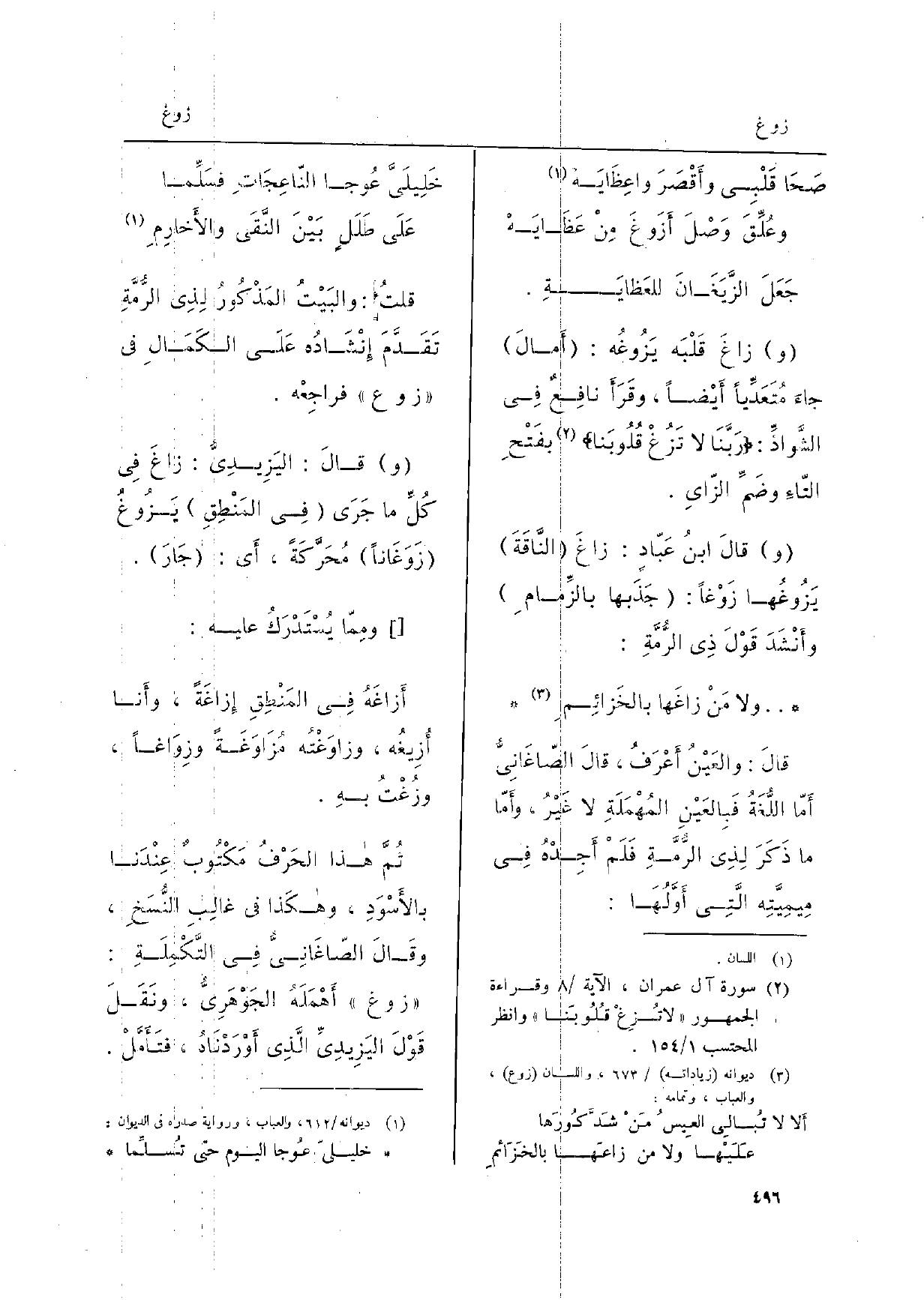 وقالَ ابنُ عَبّادٍ: زاغَ النَّاقَةَ} يَزُوغُها {زَوْغاً: جَذَبَها بالزِّمامِ وأنْشَدَ قَوْلَ ذِي الرُّمَّةِ:. وَلَا منْ} زاغَها بالخَزائِمِ قالَ: والعَيْنُ أعْرَفُ، قالَ الصّاغَانِيُّ أمّا اللُّغَةُ فبالعَيْنِ المُهْمَلَةِ لَا غَيْرُ، وأمّا مَا ذَكَرَ لذِي الرُّمَّةِ فلمْ أجِدْه فِي مِيمَّتِه الّتِي أوَّلُهَا: