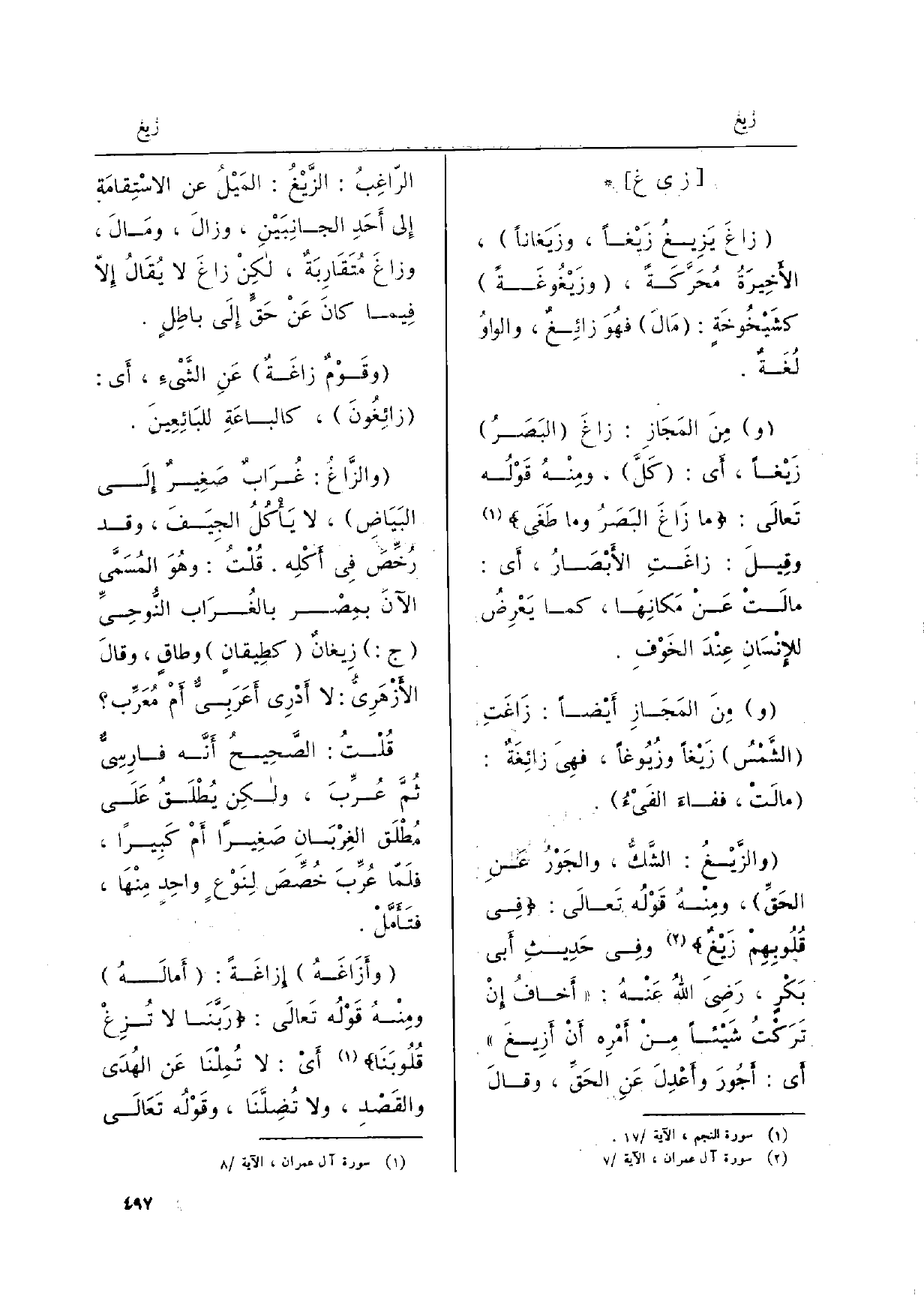 {والزَّيْغُ: الشَّكُ، والجَوْرُ عَن الحقِّ، ومِنْهُ قوْلُه تَعَالَى: فِي قُلُوبِهِم} زَيْغٌ، وَفِي حديثِ أبي بَكْرٍ، رَضِي الله عَنهُ: أخافُ إنْ تَرَكْتُ شَيئاً منْ أمْرِه أنْ {أزِيغَ، أَي: أجُورَ وأعْدِلَ عنِ الحَقِّ، وقالَ الرّاغِبُ:} الزَّيْغُ المَيْلُ عَن الاسْتِقامَةِ إِلَى أحَدِ الجانِبَيْنِ وزالَ، ومالَ، {وزاغَ مُتَقَارِبَةٌ، لكنْ زاغَ لَا يُقَالُ إِلَّا فِيمَا كانَ عنْ حَقٍّ إِلَى باطِلٍ.