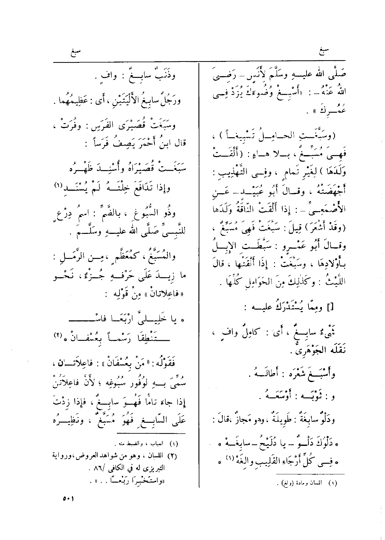 ودَلْوٌ سابِغَةٌ: طَوِيلَةٌ، وَهُوَ مجازٌ، قالَ:) دَلْوُكَ دَلْوٌ يَا دُلَيْحُ سابِغَهْ فِي كُلِّ أرْجَاءِ القَلِيبِ والِغَهْ وذَنَبٌ سابِغٌ: وافٍ.