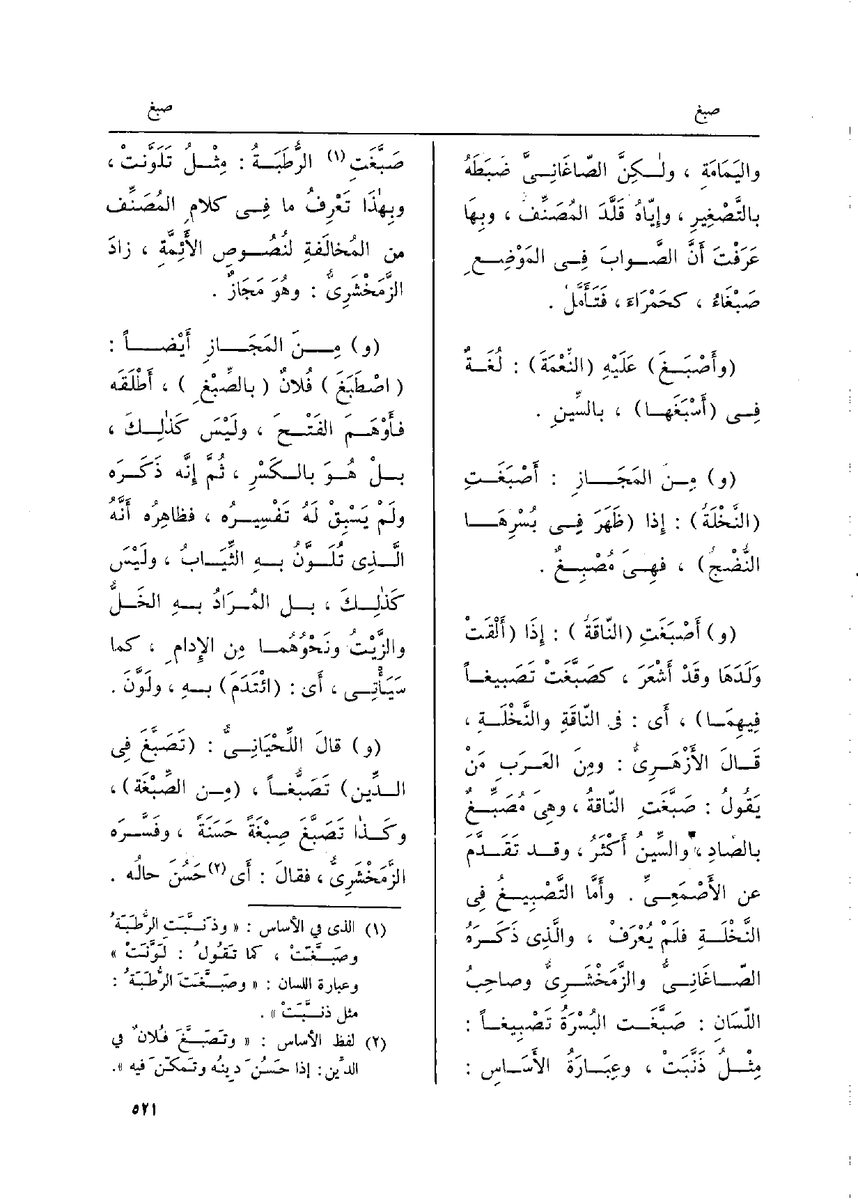 وَمن المَجَازِ أيْضاً: اصْطَبَغَ فُلانٌ بالصِّبْغِ، أطْلَقَه فأوْهَمَ الفَتْحَ، ولَيْسَ كذلكَ، بلْ هُوَ بالكَسْرِ، ثُمَّ إنَّهُ ذكَرَه ولمْ يَسْبِق لَهُ تَفْسِيرُه، فظاهِرُه أنَّهُ الّذِي تُلَوَّنُ بهِ الثِّيَابُ، ولَيْسَ كذلكَ، بل المُرَادُ بهِ الخُلُّ والزَّيتُ ونَحْوُهُما من الإدامِ، كَمَا سَيَأْتِي أَي: ائْتَدَمَ بهِ، ولَوَّنَ.