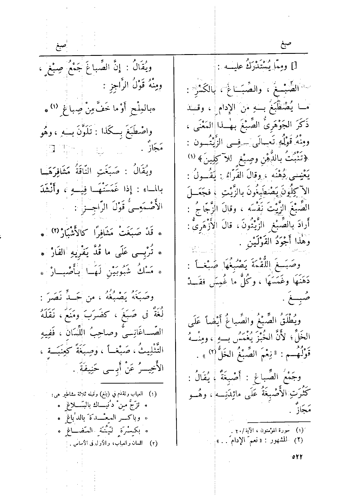 وممّا يستدْرَكُ عليهِ: الصِّبْغُ، والصِّبَاغُ، بالكَسْرِ: مَا يُصْطَبَغُ بهِ من الإدامِ، وَقد ذكَرَ الجَوْهَرِيُّ الصِّبْغَ بِهَذَا المَعْنَى، ومنهُ قولُه تَعَالَى فِي الزَّيْتُونِ: تَنْبُتُ بالدُّهْنِ وصِبْغٍ للآكِلينَ، يَعْنِي دُهْنَه، وقالَ الفَرّاءُ: يَقُولُ: الآكِلُونَ يَصْطَبِغُونَ بالزَّيْتِ، وقالَ الزَّجاجُ: أرادَ بالصِّبْغِ الزَّيْتُونَ، قالَ الأزْهَرِيُّ: وَهَذَا أجْوَدُ القَوْلَيْنِ.