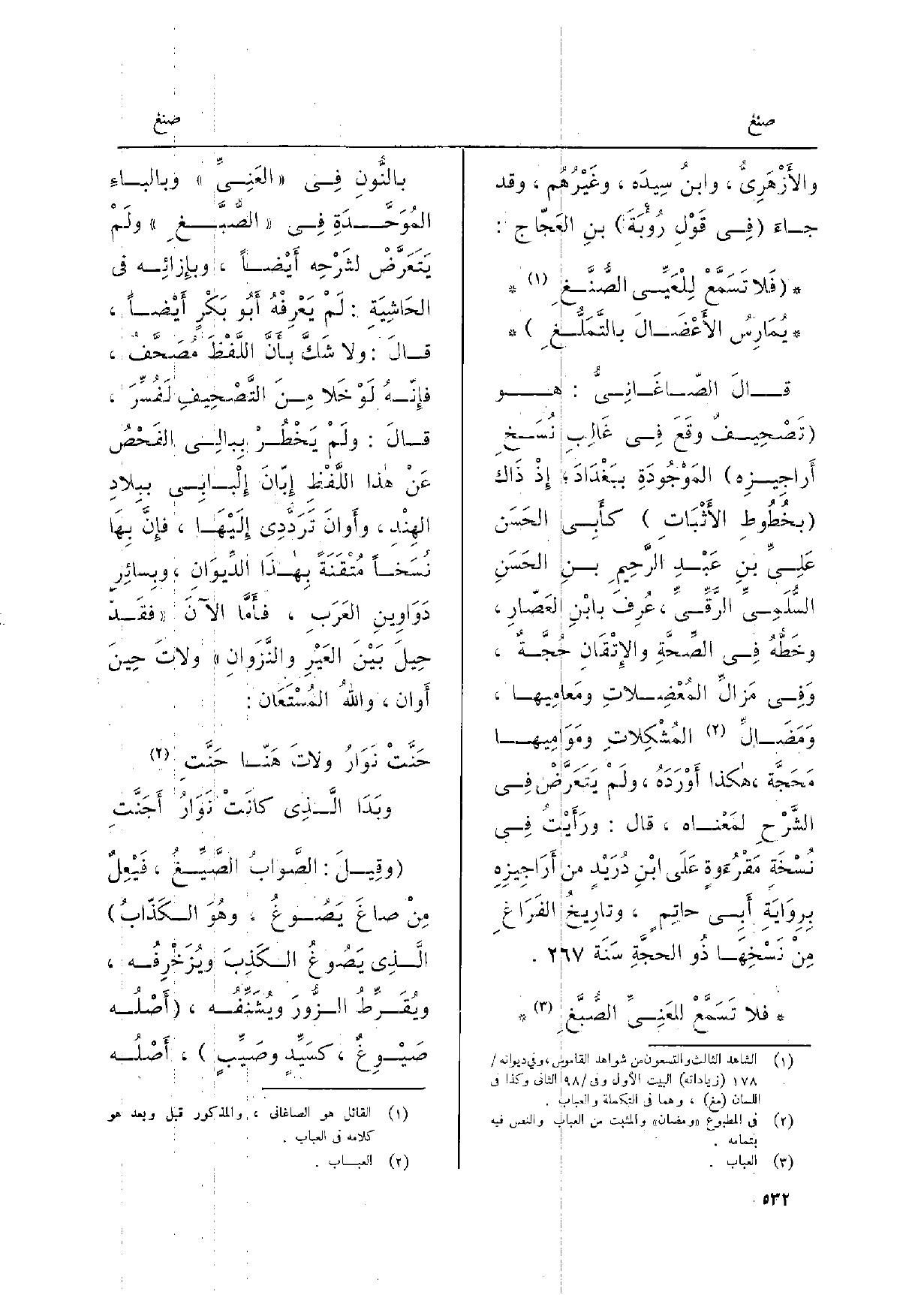 والأزْهَرِيُّ وابنُ سيدَه، وغَيْرُهُم وَقد جاءَ فِي قَوْلِ رُؤْبَةَ بنِ العَجّاجِ: فَلَا تَسَمَّعْ للعَيِّي الصُّنَّغِ يُمَارِسُ الأعْضَالَ بالتَّمَلُّغِ قالَ الصّاغَانِيُّ: هُوَ تَصْحِيفٌ وقَعَ فِي غالِبِ نُسَخِ أراجِيزه المَوْجُودَةِ فِي بَغْدادَ، إذْ ذاكَ بخُطُوطِ الأثْبَاتِ كَأبي الحَسَن عليِّ بنِ عَبدِ الرَّحِيمِ بنِ الحَسَنِ السُّلَمِيِّ الرَّقِّيِّ، عُرِفَ بابْنِ العَصّارِ وخَطُه فِي الصِّحَّةِ والإتْقَانِ حُجَةٌ، وَفِي مَزالِّ المُعْضِلاتِ ومعاميها، ومَضَالِّ المُشْكِلاتِ ومَوَامِيها مَحَجَّة، هَكَذَا أوْرَدَهُ وَلم يتَعَرَّضْ فِي الشَّرْحِ لمَعْناه، قَالَ: ورَأيْتُ فِي نُسْخَةٍ مَقْرُءَوةٍ على ابنِ دُرَيدٍ من أراجِيزه بِرِوايَةِ أبي حاتِمٍ، وتاريخُ الفَرَاغِ منْ نُسْخِهَا ذُو الحجَّةِ سنة.