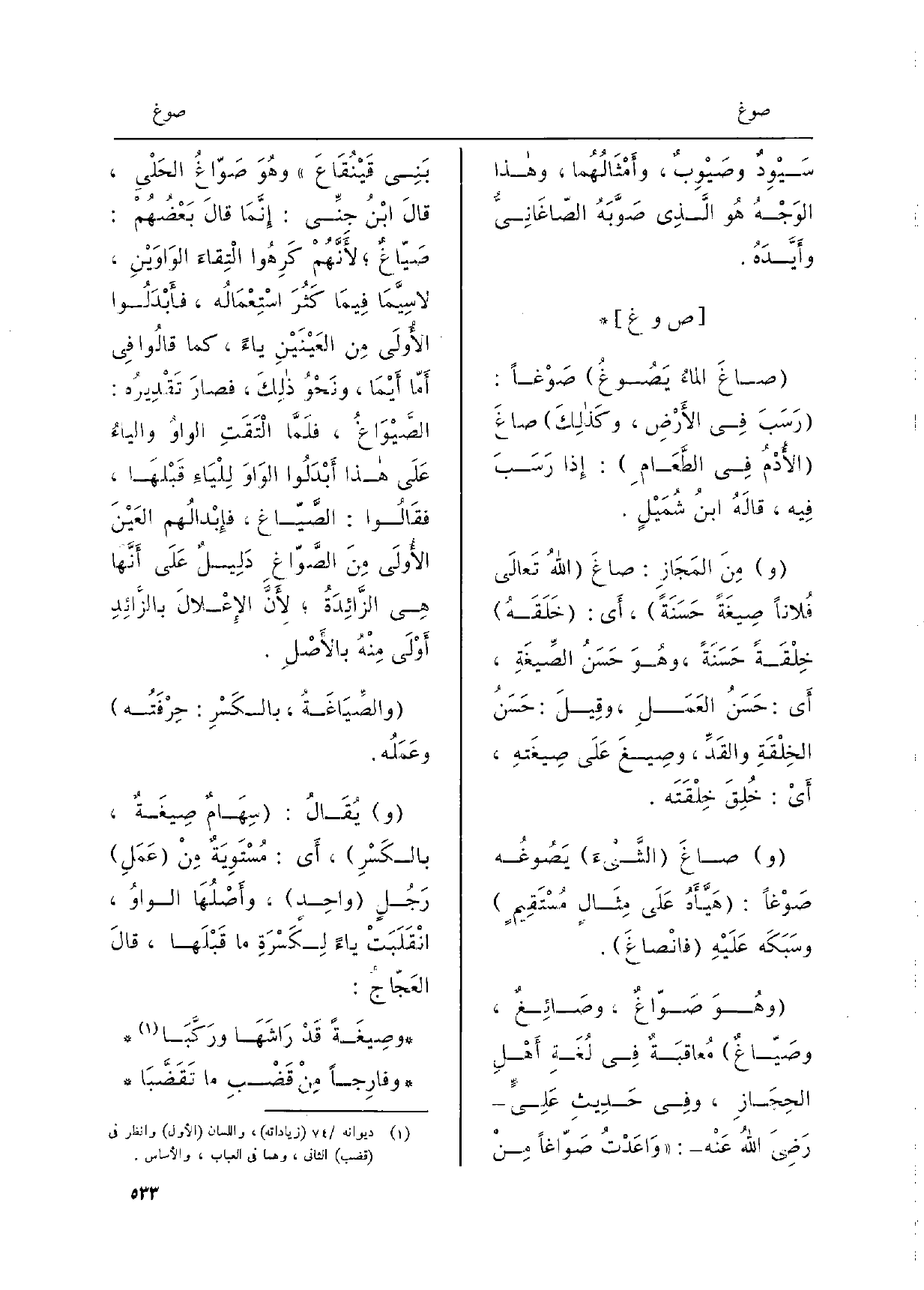 وهُوَ {صَوّاغٌ،} وصائِغٌ، {وصَيّاغٌ مُعاقَبَةٌ فِي لُغَةِ أهْلِ الحِجَازِ، وَفِي حديثِ عليٍّ رَضِي الله عَنهُ: واعَدْتُ} صَوّاغاً منْ بَنِي قَيْنُقَاعَ وهُوَ {صَوّاغُ الحَلْيِ، قالَ ابنُ جِنِّي: إنَّمَا قالَ بَعْضُهُم} صَيّاغُ، لأنَّهُمْ كَرِهثوا الْتِقاءَ الوَاوَيْنِ، لَا سَيَّمَا من العَيْنَيْنِ يَاء، كَمَا قَالُوا فِي أمّا أيْمَا، ونَحْوُ ذلكَ فصارَ تَقْدِيرُه: الصَّيْوَاغُ، فلَمَّا الْتَقَتِ الواوُ والياءُ على هَذَا أبْدَلُوا الواوَ لليَاءِ قَبْلَها، فقالُوا: الصَّيّاغُ، فإبْدَالُهم العَيْنَ الأُولى منَ الصَّواغِ دَلِيلٌ على أنَّهَا هِيَ الزَّائِدَةُ، لأنَّ الإعْلالَ بالزَّائِدِ أوْلَى منْهُ بالأصْلِ.