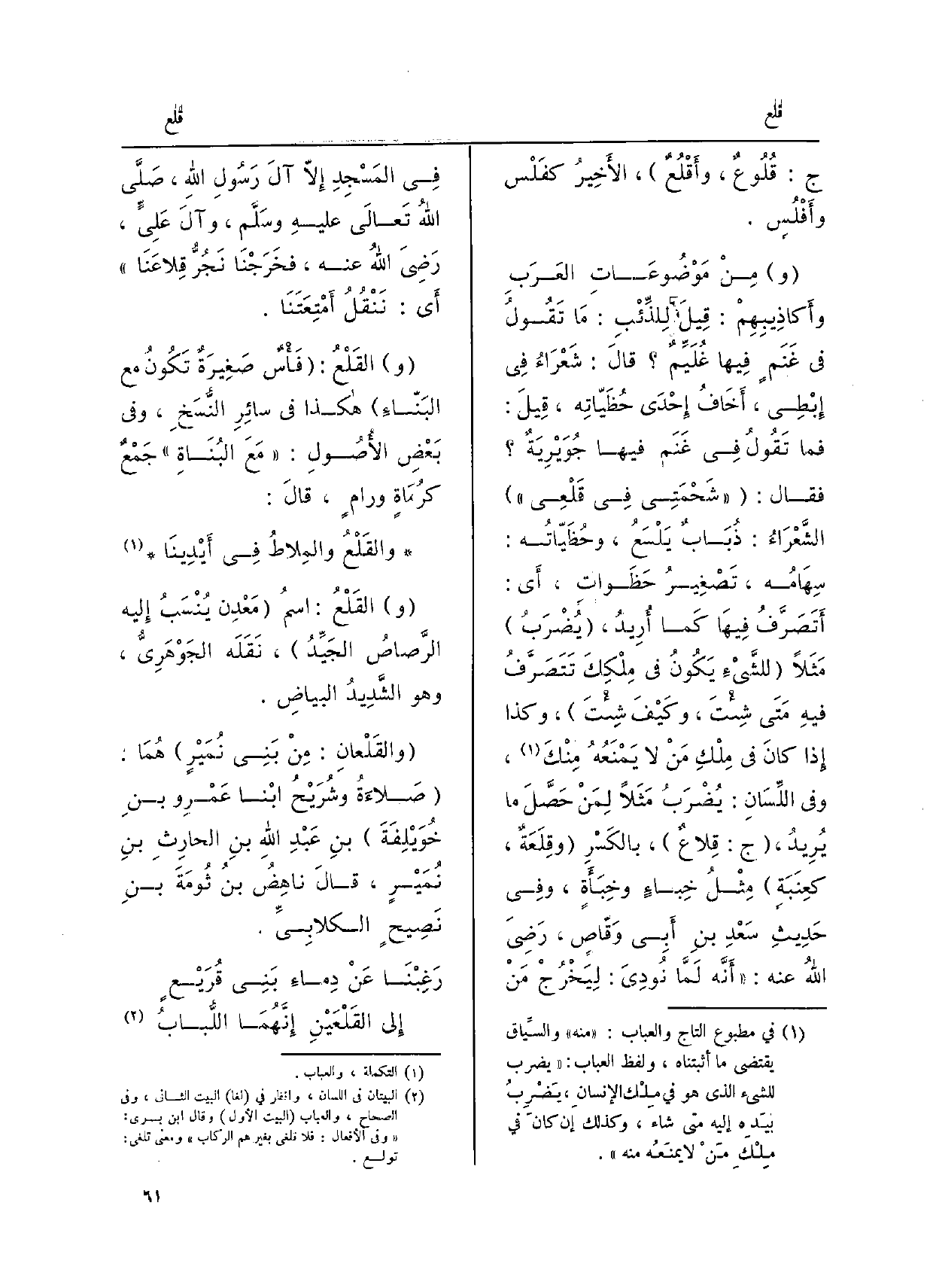 ومِنْ مَوْضُوعَاتِ العَرَبِ وأكاذِيبِهمْ: قِيلَ للذِّئبِ: مَا تَقُولُ فِي غَنَمٍ فِيهَا غُلَيِّمٌ قالَ: شَعْرَاءُ فِي إبْطِي، أخَافُ إحْدَى خُظَيّاتِه، قيلَ: فَمَا تَقُولُ فِي غَنَم فِيهَا جُوَيْرِيةٌ فَقَالَ: شَحْمَتي فِي قَلْعِي الشَّعراءُ: ذُبَابُ يَلْسَعُ، وحُظَيّاتُه: سِهَامُه، تَصْغِيرُ حظَوات، أَي: أتَصَرَّفُ فيهَا كَما أُرِيدُ، يُضْرَبُ مَثَلاً للشَّيءِ يَكُونُ فِي مِلْكِكَ تَتَصَرَّفُ فيهِ مَتَى شِئتَ، وكَيْفَ شِئْتَ، وَكَذَا إِذا كانَ فِي مِلْكِ مَنْ لَا يَمْنَعُهُ مِنْكَ، وَفِي اللِّسانِ: يُضْرَبُ مَثَلاً لِمَنْ حَصَّلَ مَا يُرِيدُ، ج: قِلاعٌ، بالكَسْرِ وقِلَعَةٌ، كعِنَبَةٍ، مِثْلُ خِباءٍ وخِبَأةٍ، وَفِي حديثِ سَعْدِ بنِ أَب وَقّاصٍ، رضيَ اللهُ عَنهُ: أنَّه لَمَّا نُودِيَ: ليَخْرُجْ مَنْ فِي المسْجِد إلاّ آلَ رسُولِ اللهِ، صلى الله عَلَيْهِ وَسلم وآلَ عَلِيٍّ، رضيَ اللهُ عَنهُ، فخَرَجْنَا نَجُرُّ قِلاعَنا، أَي: نَنْقُلُ أمْتِعَتَنَا.