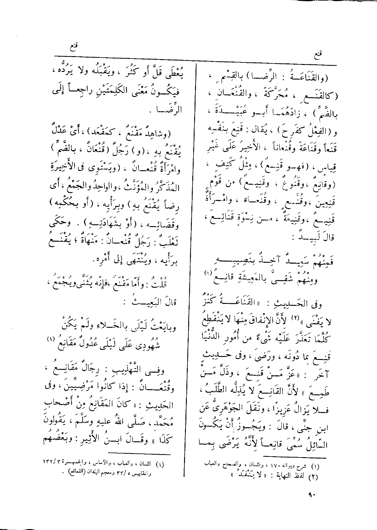 ورَجُلٌ قانِعٌ وقَنِيعٌ، وَفِي التَّنْزِيلِ العَزيزِ: وأطْعِمُوا القَانِعَ والمُعْتَر، فالقَانِعُ: الّذِي يَسْألُ، والمُعْتَرُّ: الّذِي يَتَعرَّضُ وَلَا يَسْألُ، وقِيلَ: القانِعُ هُنَا: المُتَعَفِّفُ عَن السُّؤَالِ، وكُلٌّ يَصْلُحُ، قالَ عدِيُّ بنُ زَيْدِ: