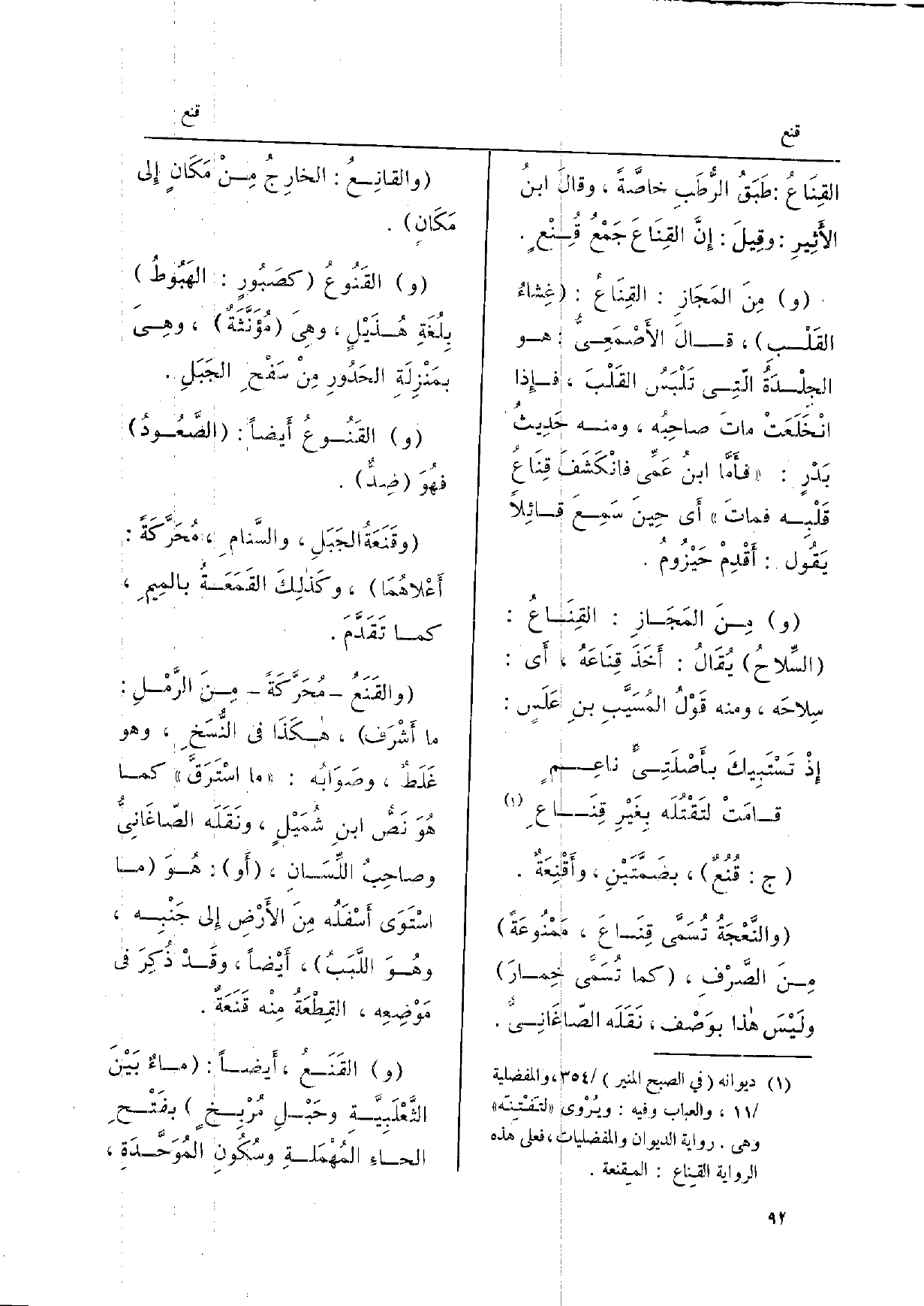 وَمن المَجَازِ القِناعُ: السِّلاحُ يُقَالُ أخَذَ قِنَاعَهُ، أَي: سِلاحَه، وَمِنْه قَوْلُ المُسَيَّبِ بنِ عَلَسٍ: