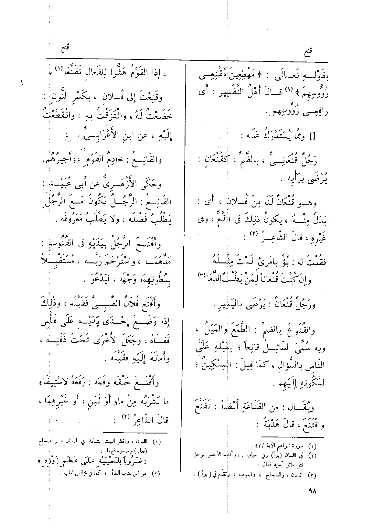 ِ بقَوْلِه تعالَى: مُهْطِعينَ مُقْنعِي رُؤُسِهِمْ، قالَ أهْلُ التَّفْسيرِ: أَي رافِعي رُؤُسهِم.