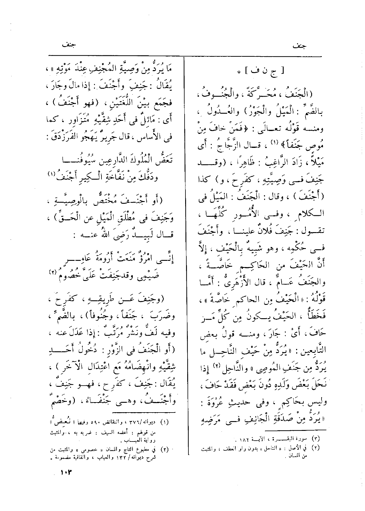 ) الْجَنَفُ، مُحَرَّكَةً، والْجُنُوفُ، بِالضَّمِّ: الْمَيْلُ والْجَوْرُ والعُدُولُ، وَمِنْه قَوْلُه تعالَى:) فَمَنْ خافَ مِنْ مُوصٍ جَنَفاً، قَالَ الزَّجَّاجُ: أَي مَيْلاً، زَادَ الرَّاغِبُ: ظَاهِراً، وَقد جَنِفَ فِي وَصِيَّتِهِ، كفَرِحَ، وَكَذَا أجْنَفَ، وَقَالَ: الْجَنَفُ: المَيْلُ فِي الكلامِ، وَفِي الأُمُورِ كُلِّهَا، تَقول: جَنِفَ فُلانٌ علينا، وأجْنَفَ فِي حُكْمِه، وَهُوَ شَبِيهٌ بِالْحَيْفِ، إِلا أَنَّ الحَيْفَ من الحَاكِمِ خَاصَّةً، والجَنَفُ عَامٌّ، قَالَ الأًزْهَرِيُّ: أَمَّا قَوْلُهُ:) الْحَيْفُ مِن الحاكمِ خَاصَّةً (، فَخَطَأٌ، الحَيْفُ يكونُ مِن كُلِّ مِن حَافَ، أَيْ: جَارَ، وَمِنْه قولُ بعضِ التَّابِعين:) يُرَدُّ مِنْ حَيْفِ النَّاحِل مَا يُرَدُّ مِن جَنَفِ المُوصِي (والنَّاحِل إِذا نَحَلَ بَعْضَ وَلَدِهِ دُونَ بَعْضٍ فَقَدْ حَافَ، وَلَيْسَ بحَاكِمٍ، وَفِي حديثِ عُرْوَةَ:) يُرَدُّ مِنْ صَدَقَةِ الْجَانِفِ فِي مَرَضِهِ مَا يُرَدُّ مِنْ وَصِيَّةِ المُجْنِفِ عِنْدَ مَوْتِهِ (، يُقَالُ: جَنِفَ وأَجْنَفَ: إِذا مالَ وجَارَ، فجَمَع بيْنَ اللُّغَتَيْنِ، فَهُوَ أَجْنَفُ، أَي: مَائِلٌ فِي أَحَدِ شِقَّيْهِ مُتَزَاوِر، كَمَا فِي الأَساس، قَالَ جَرِيرٌ يَهَجُوا الفَرَزْدَقَ: