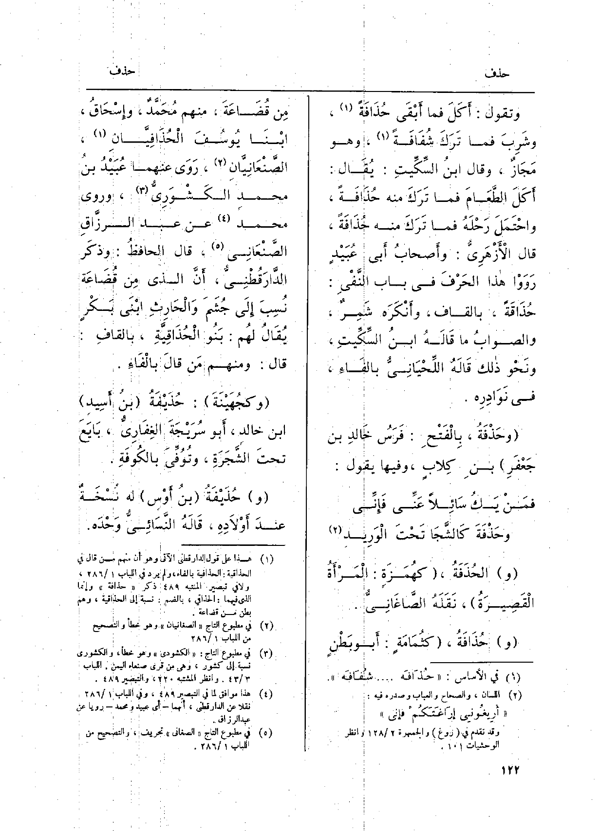 وذكَر الدَّارَقُطْنِيُّ، أَنَّ الَّذِي مِن قُضَاعَة نُسِبَ إِلَى جُشَمَ والْحَارِثِ اْنَي بَكْرٍ يٌ قَالٌ لُهم: بَنُو الْحُذَاقِيَّةِ، بالقافِ: قَالَ: وَمِنْهُم مَن قالَ بالْفَاءِ.