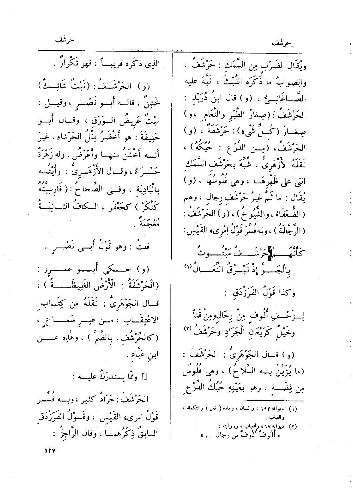 ومّما يُسْتَدْرَكُ عَلَيْهِ: الحَرْشَفُ: جَرَادٌ كثير، وَبِه فُسِّر قَوْلُ امرىءِ القَيْسِ، وقَوْلُ الفَرَزْدَقِ السابقُ ذِكْرُنهما، وَقَالَ الرَّاجِزُ: