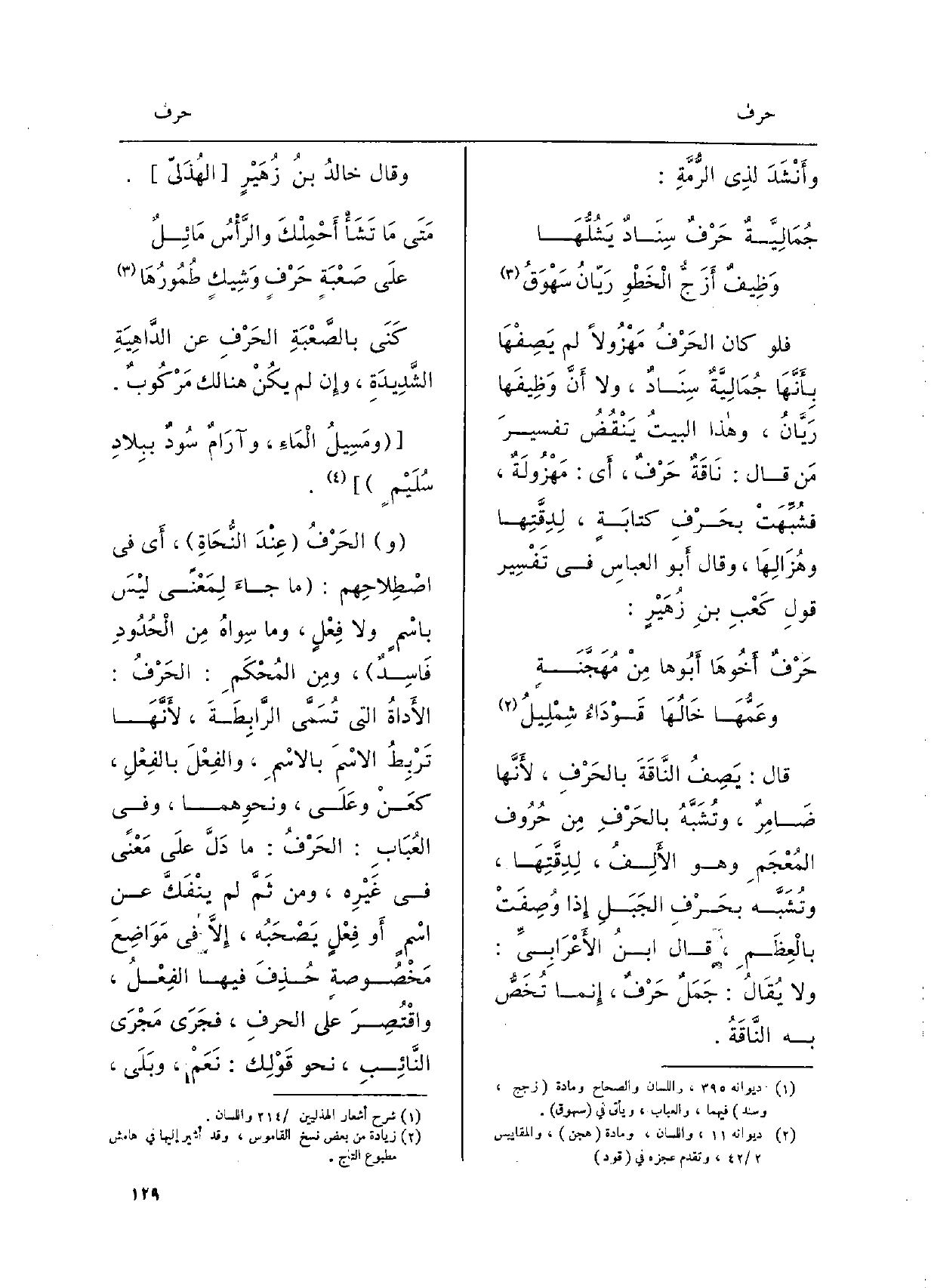 فَلَو كَانَ الحَرْفُ مَهْزُولاً لم يَصِفْهَا بِأَنَّهَا جُمَالِيَّةٌ سِنَادٌ وَلَا أَنَّ وَظِيفَها رَيَّانُ وَهَذَا البيتُ يَنْقُضُ تفسيرَ مَن قَالَ: نَاقَةٌ حَرْفٌ أَي: مَهْزُولَةٌ فشُبِّهَتْ بحَرْفِ كتابَةٍ، لِدِقَّتِها وهُزَالِهَا وَقَالَ أَبو العباسِ فِي تَفْسِير قولِ كَعْبِ بنِ زُهَيْرٍ: