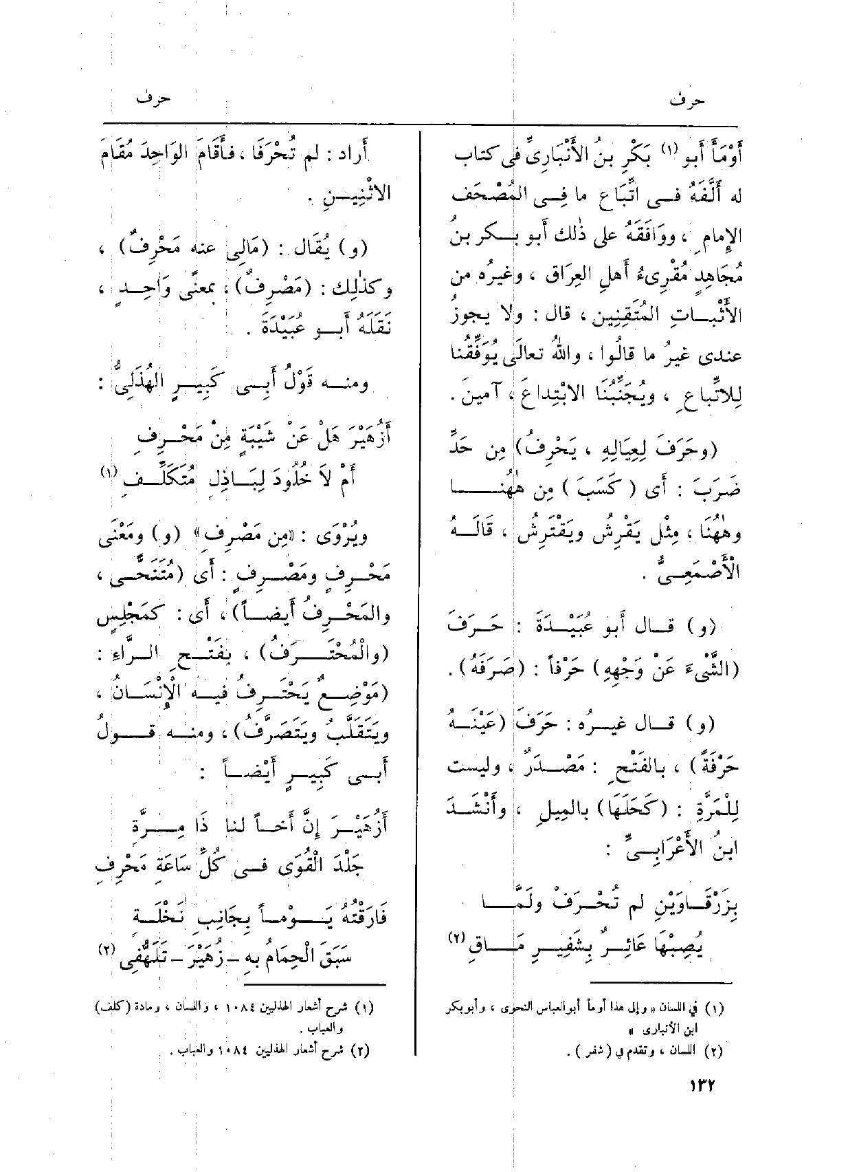 أََراد: لم تُحْرَفَا، فأَقَامَ الوَاحِدَ مُقَامَ الاثْنِينِ. يُقَال: مَالِي عَنهُ مَحْرِفٌ، وكذلِك: مَصْرِفٌ، بِمَعْنى وَاحِدٍ، نَقَلَهُ أَبو عُبَيْدَةَ.)
