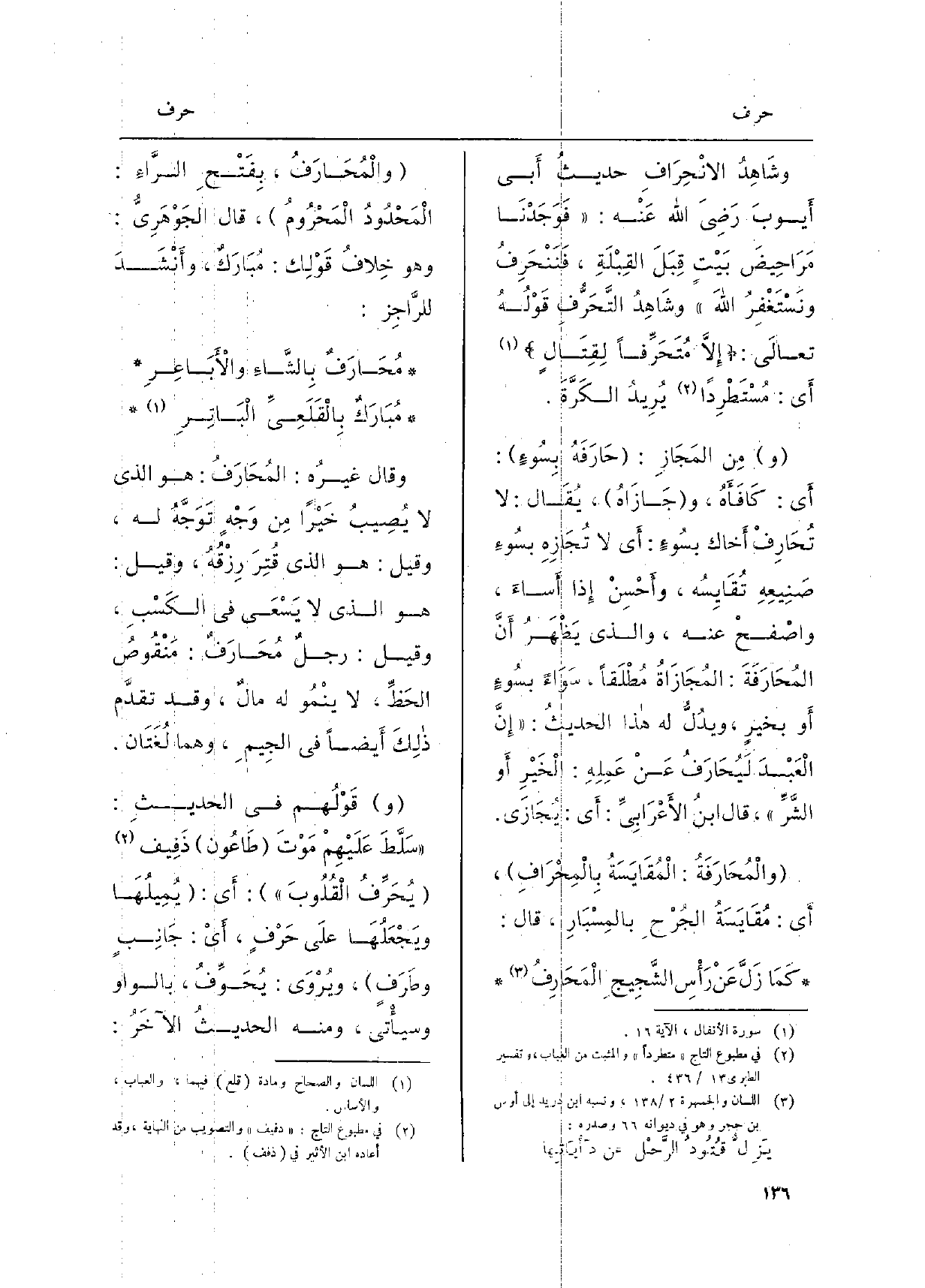 والْمُحَارَفُ: الْمُقَايَسَةُ بالْمِحْرَافِ، أَي: مُقَايَسَةُ الجُرْحِ بالمِسْبَارِ،، قَالَ: كَمَا زَلَّ عَنْ رَأْسٍ الشَّجِيجِ الْمَحَرِفُ والمُحَارَفُ، بِفَتْحِ الرَّاءِ: المَحْدودُ الْمَحْرُومُ، قَالَ: الجَوْهَرِيُّ: وَهُوَ خِلافُ قَوْلِك: مُبَارَكٌ، وأَنْشَدَ للرَّاجِز: مُحَارَفُ بِالشَّاءِ والأَبَاعِرِ مُبَارَكٌ بِالْقَلَعِيِّ الْبَاتِرِ)