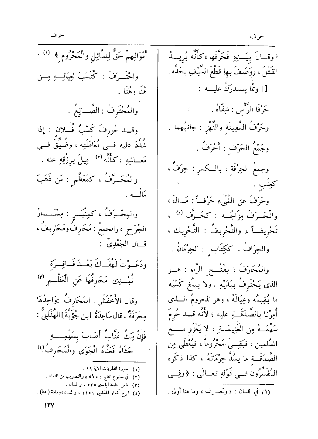 وجَمْعُ الحَرْفِ: أَحْرَفٌ. وجَمْعُ الحَرْفَةِ، بالكسرِ: حِرَفٌ كعِنَبٍ.