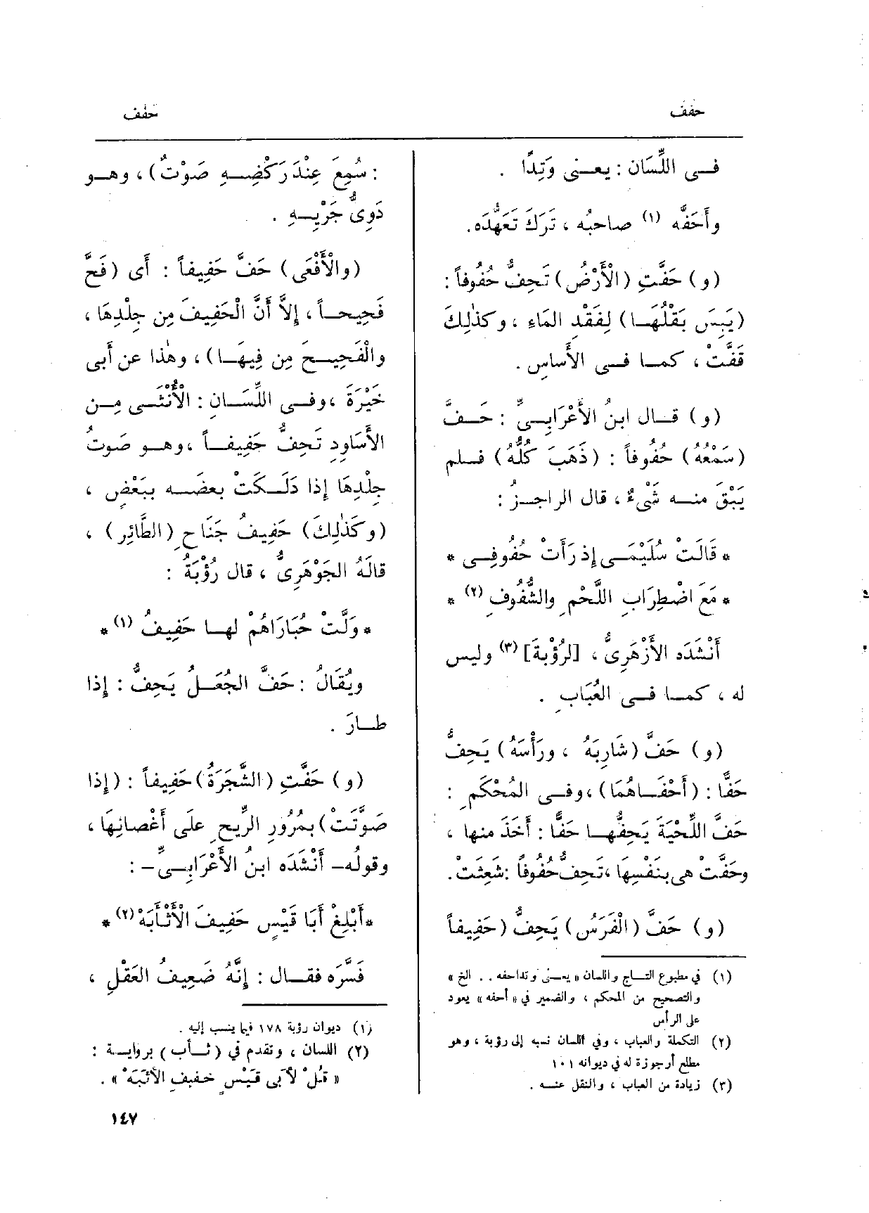 قَالَ ابنُ الأَعْرَابِيِّ: حَفَّ سَمْعُهُ} حُفُوفاً: ذَهَبَ كُلُّهُ فَلم يَبْقَ مِنْهُ شَيْءٌ، قَالَ الراجزُ:) قَالَتْ سُلَيْمَى إِذ رَأَتْ {حُفُوفِي مَعَ اضْطِرَابِ اللَّحْمِ والشُّفُوفِ أَنْشَدَه الأَزْهَرِيُّ، لرُؤْبةَ وَلَيْسَ لَهُ، كَمَا فِي العُبَابِ. حَفَّ شَارِبَهُ، ورَأْسَهُ يَحِفُّ} حَفَّا: {أَحَفَاهُمَا، وَفِي المُحْكَمِ: حَفَّ اللِّحْيَةَ} يَحِفُّها حَفًّا: أَخَذَ مِنْهَا، {وحَفَّتْ هِيَ بنَفْسِهَا، تَحِفُّ حُفُوفاً: شَعِثَتْ. حَفَّ الْفَرَسُ يَحِفُّ} حَفِيفاً: سُمِعَ عِنْدَ رَكْضِهِ صَوْتٌ، وَهُوَ دَوِيُّ جَرْيِهِ. والأَفْعَى حَفَّ حَفِيفاً: أَي فَحَّ فَحِيحاً، إِلاَّ أَنَّ {الْحَفِيفَ مِن جِلْدِهَا، والْفَحِيحَ مِنْ فِيهَا، وَهَذَا عَن أَبي خَيْرَةَ، وَفِي اللِّسَانِ: الأُنْثَى مِنْ الأَسَاوِدِ} تَحِفُّ حَفِيفاً، وَهُوَ صَوتُ جِلْدِهَا إِذا دَلَكَتْ بعضَ ببَعْضٍ، وكَذلِكَ! حَفِيفُ جَنَاحِ الطَّائِر، قالَهُ الجَوْهَريُّ، قَالَ رُؤْبَةُ: وَلَّتْ حُبَارَاهُمْ لَهَا حَفِيفُ ويُقَالُ: حَفَّ الجُعَلُ يَحِفُّ: إِذا طارَ. حَفَّتِ الشَّجَرَةُ حَفِيفاً: إِذَا صَوَّتَتْ بمُرُورِ الرِّيحِ علَى أَغْصَانِهَا، وقولُه أَنْشَدَه ابنُ الأَعْرَابِيِّ: أَبْلِغْ أَبَا قَيْسٍ حَفِيفَ الأَثْأَبَهْ فَسَّرَه فَقَالَ: إِنَّهُ ضَعِيفُ العَقْلِ،
