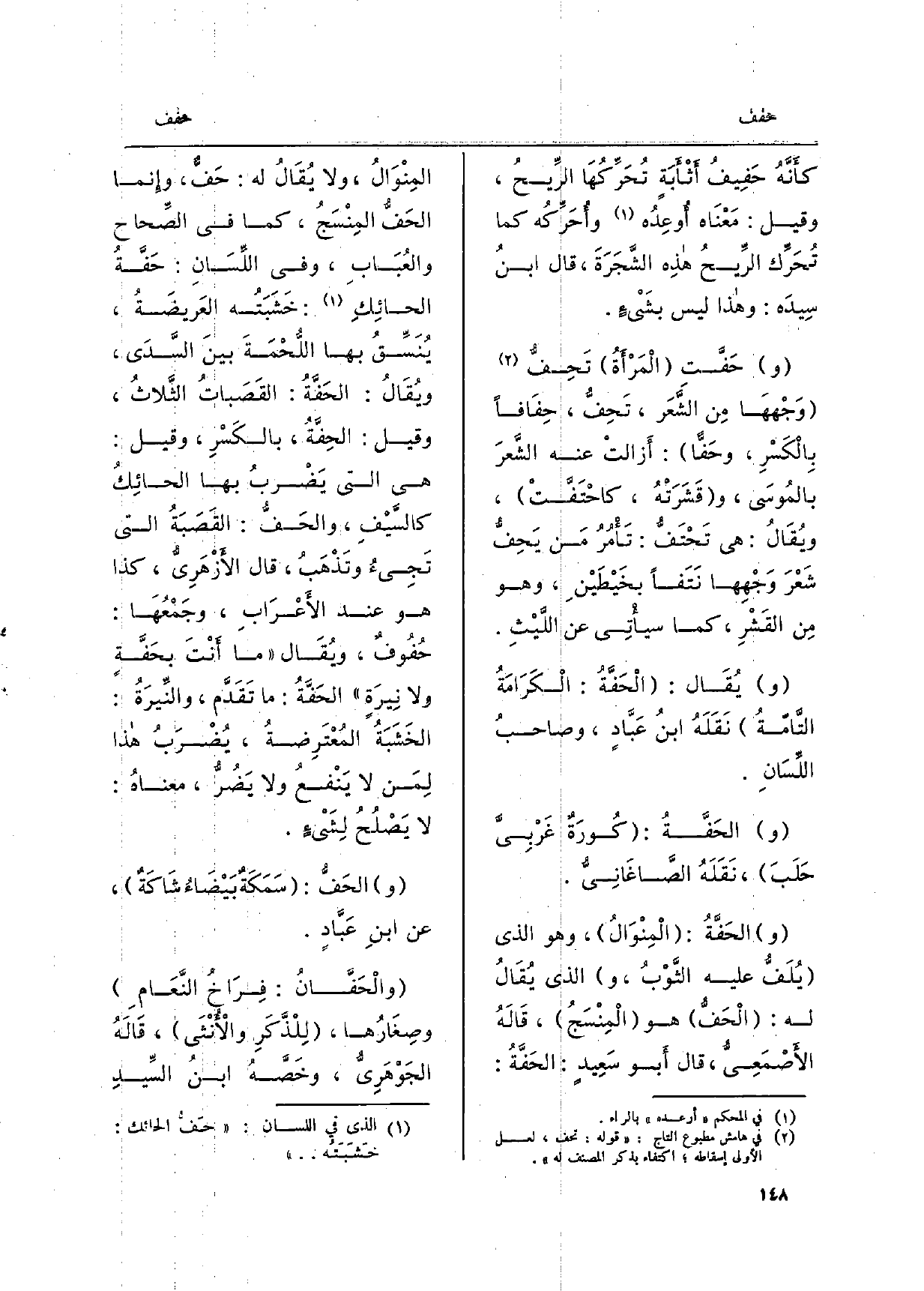 كأَنَّهُ حَفِيفُ أَثْأَبَةٍ تُحَرِّكُهَا الرِّيحُ، وَقيل: مَعْنَاه أُوعِدُه وأُحَرِّكُه كَمَا تُحَرِّك الرِّيحُ هذِه الشَّجَرَةَ، قَالَ ابنُ سِيدَه: وَهَذَا لَيْسَ بشَيْءٍ. حَفَّتِ الْمَرْأَةُ تَحِفُّ وَجْههَا مِن الشَّعَر، تَحِفُّ، {حِفَافاً بِالْكَسْرِ،} وحَفًّا: أَزالتْ عَنهُ الشَّعرَ بالمُوسَى، وقَشَرَتْهُ، {كاحْتَفَّتْ، ويُقَالُ: هِيَ} تَحْتَفُّ: تَأْمُرُ مَن {يَحِفُّ شَعْرَ وَجْهِها نَتَفاً بخَيْطَيْنِ، وَهُوَ مِن القَشْرِ، كَمَا سيأْتِي عَن اللَّيْثِ. يُقَال:} الْحَفَّةُ: الْكَرَامَةُ التَّامّةُ نَقَلَهُ ابنُ عَبَّادٍ، وصاحبُ اللِّسَانِ. الحَفَّةُ: كُورَةٌ غَرْبِيَّ حَلَبَ، نَقَلَهُ الصَّاغَانِيُّ.