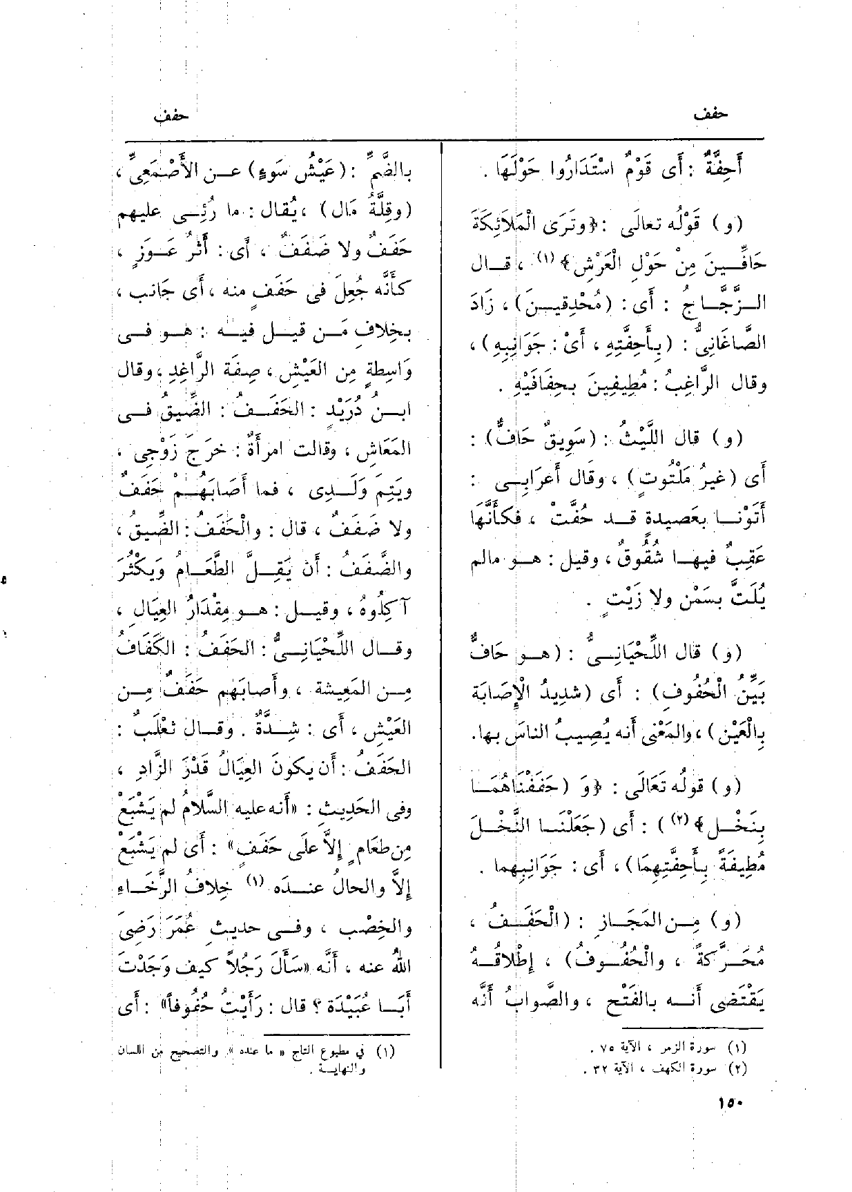 قولُه تَعَالَى: وَ {حَفَفْنَاهُمَا بِنَخْلٍ: أَي جَعَلْنَا النَّخْلَ مُطِيفَةً} بِأَحِفَّتِهِمَا، أَي، جَوَانِبِهما. مِن المَجَازِ: {الْحَفَفُ، مُحَرَّكةً،} والْحُفُوفُ، إِطْلاقُهُ يَقْتَضي أَنه بالفَتْح، والصَّوابُ أَنَّه بالضَّمِّ: عَيْشُ سَوءٍ عَن الأَصْمَعِيِّ، وقِلَّةُ مَال، يُقال: مَا رُئِي عَلَيْهِم {حَفَفٌ وَلَا ضَفَفٌ، أَي: أَثرُ عَوَزٍ،)