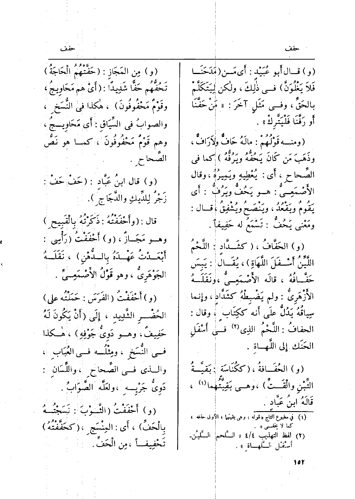 قَالَ ابنُ عَبَّادٍ: {حَفْ} حَفْ: زَجْرٌ لِلدِّيكِ والدَّجَاجِ. قَالَ: {وأَحْفَفْتُهُ: ذَكَرْتُهُ بِالْقَبِيحِ وَهُوَ مَجَازٌ،} أَحْفَفْتُ رَأْسِي: أَبْعَدْتُ عَهْدَهُ بِالدُّهْنِ، نَقَلَهُ الجَوْهَرِيُّ، وَهُوَ قَوْلُ الأَصْمَعِيِّ. (و) {أَحْفَفْتُ الفَرَسَ: حَمَلْتُه على الحُضْرِ الشَّدِيدِ، إِلَى أَنْ يَكُونَ لَهُ} حَفِيفٌ، وَهُوَ دَوِيُّ جَوْفِهِ، هَكَذَا النُّسَخِ، ومِثْلُه فِي العُبَابِ، وَالَّذِي فِي الصِّحاحِ، واللِّسَانِ: دَوِيُّ جَرْيِهِ، ولعَلَّه الصَّوَابُ. أَحْفَفْتُ الثَّوْبَ: نَسَجْتُهُ {بِالْحَفِّ، أَي: المِنْسِجِ،} كحَفَّفْتُهُ {تَحْفِيفاً، مِن} الْحَفِّ.