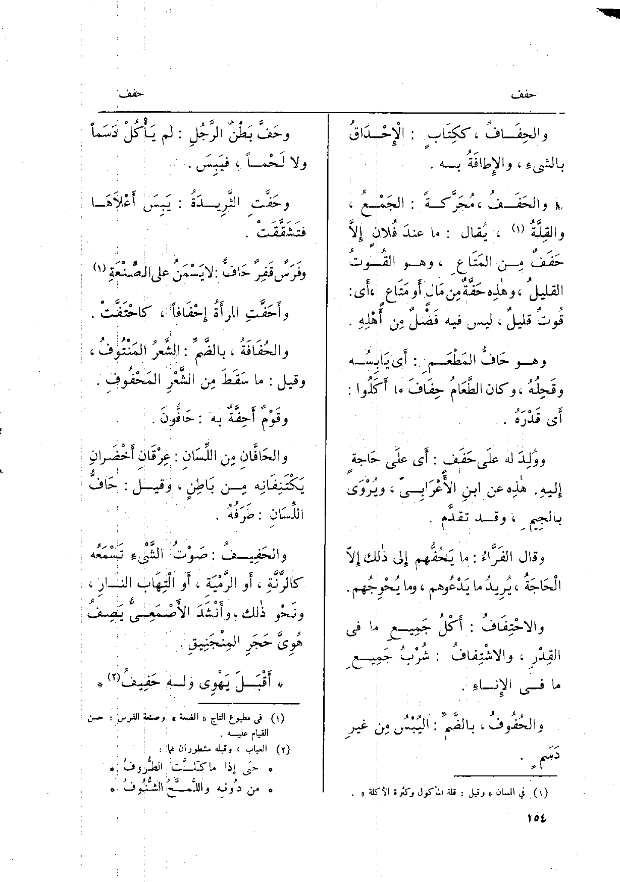 } والاحْتِفَافُ: أَكْلُ جَمِيعِ مَا فِي القِدْرِ، والاشْتِفافُ: شُرْبُ جَمِيعِ مَا فِي الإِناءِ. {والحُفُوفُ، بالضَّمِّ: اليُبْسُ مِن غيرِ دَسَمٍ.