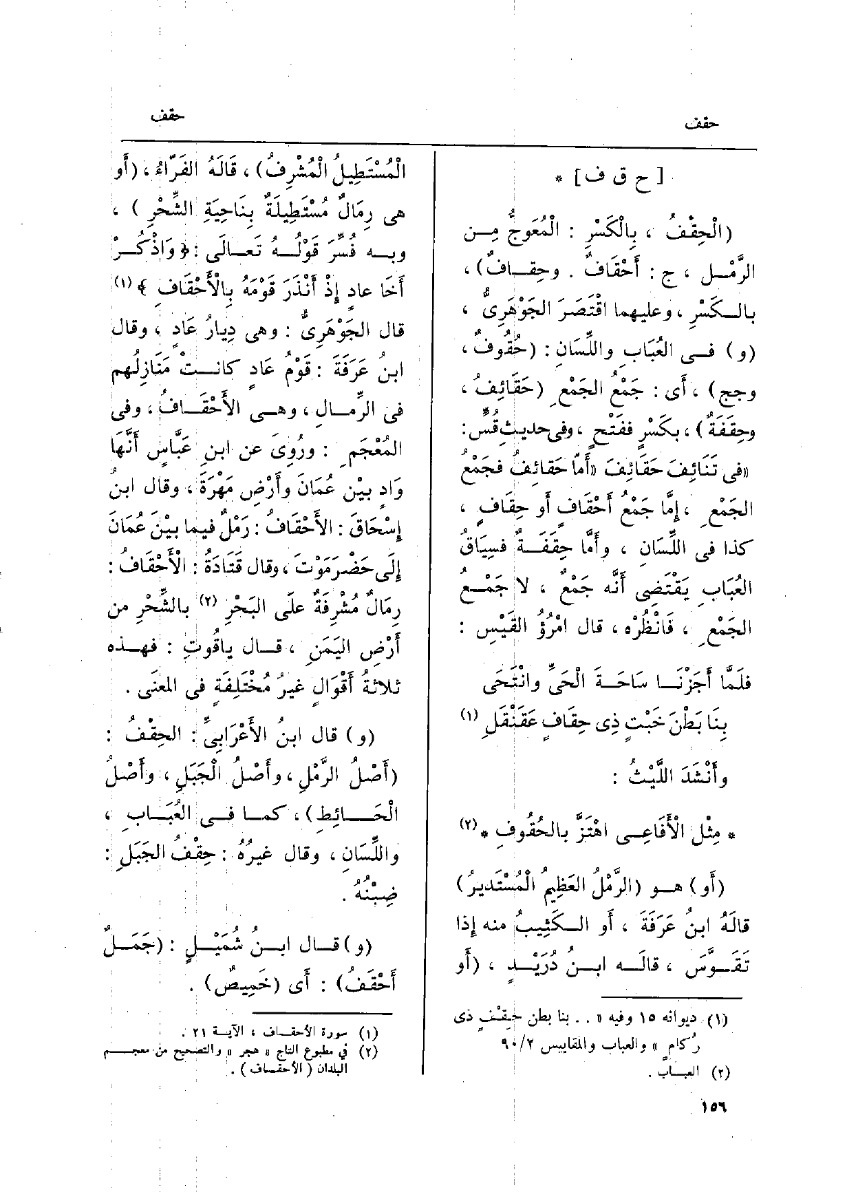 وأَنْشَدَ اللَّيْثُ: مِثْل الأَفَاعِي اهْتَزَّ بالحُقُوفِ أَو هُوَ الرَّمْلُ العَظِيمُ الْمُسْتَديرُ قالَهُ ابنُ عَرَفَةَ، أَو الكَثِيبُ مِنْهُ إِذا تَقَوَّسَ، قالَه ابنُ دُرَيْدٍ، أَو الْمُسْتَطِيلُ الْمُشْرِفُ، قَالَهُ الفَرّاءُ، أَو هِيَ رِمَالٌ مُسْتَطِيلَةٌ بِنَاحِيَةِ الشِّحْرِ، وَبِه فُسِّرَ قَوْلُهُ تَعالَى: وَاذْكُرْ أَخَا عادٍ إِذْ أَنْذَرَ قَوْمَهُ بِالأَحْقَافِ قَالَ الجَوْهَرِيُّ: وَهِي دِيارُ عَادٍ، وَقَالَ ابنُ عَرَفَةَ: قَوْمُ عَادٍ كانتْ مَنَازِلُهم فِي الرِّمالِ، وَهِي الأَحْقَافُ، وَفِي المُعْجَمِ: ورُوِيَ عَن ابنِ عَبَّاسٍ أَنَّهَا وَادٍ بيْن عُمَانَ وأَرْضِ مُهْرَةَ، وَقَالَ ابنُ إِسْحَاقَ: الأَحْقَافُ: رَمْلٌ فِيمَا بيْنَ عُمَانَ إِلَى حَضْرَمَوْتَ، وَقَالَ قَتَادَةُ: الأَحْقَافُ: رِمَالٌ مُشْرِفَةٌ علَى البَحْرِ بالشِّحْرِ من أَرْضِ اليَمَنِ، قَالَ ياقُوتِ: فَهَذِهِ ثلاثةُ أَقْوَالٍ غيرُ مُخْتَلِفَةٍ فِي المعنَى.