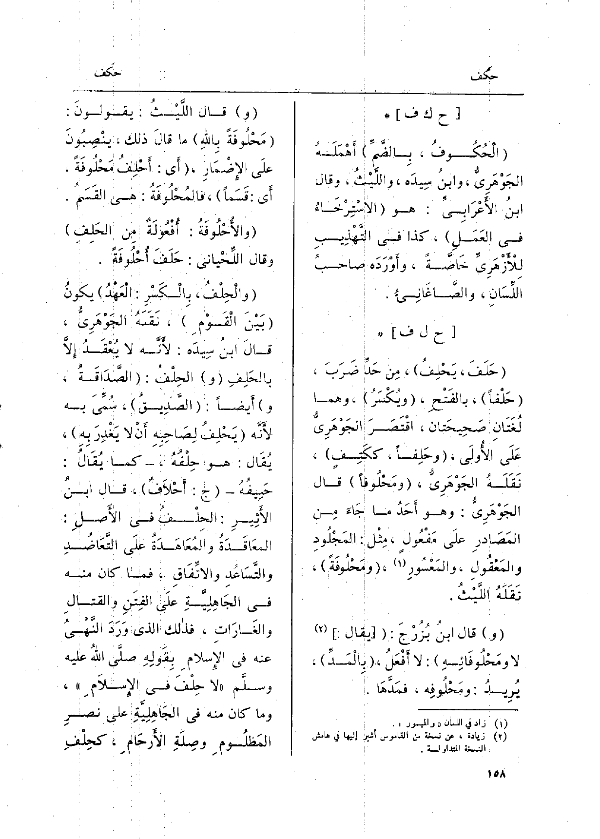 والأُحْلُوفَةَ: أُفْعُولَةٌ مِن الحَلِفِ وَقَالَ اللِّحْياني: حَلَفَ أُحْلُوفَةً. والْحِلْفُ، بالْكَسْرِ: الْعَهْدُ يكونُ بَيْنَ الْقَوْمِ، نَقَلَهُ الجَوْهَرِيُّ، قالَ ابنُ سِيدَه: لأَنَّه لَا يُعْقَدُ إِلاَّ بالحَلِفِ والحِلْفُ: الصَّدَاقَةُ، وأَيضاً: الصَّدِيقُ، سُمِّيَ بِهِ لأَنَّه يَحْلِفُ لِصَاحِبِهِ أَنْ لَا يَغْدِرَ بِهِ، يُقَال: هُوَ حِلْفُهُ، كَمَا يُقَالُ: حَلِيفُهُ ج: أَحْلاَفٌ، قَالَ ابنُ الأَثِيرِ: الحِلْفُ فِي الأَصلِ: المعَاقَدَةُ والمَعَاهَدَةُ علَى التَّعَاضُدِ والتَّسَاعُدِ والاتِّفَاقِ، فَمَا كَانَ مِنْهُ فِي الجَاهِلِيَّةِ علَى الفِتَنِ والقتالِ والغَارَاتِ، فَذَلِك الَّذِي وَرَدَ النَّهْيُ عَنهُ فِي الإِسلامِ بِقَولِهِ صلى الله عَلَيْهِ وَآله وسلَّم لَا حشلْفَ فِي الإِسلاَمِ، وَمَا كَانَ مِنْهُ فِي الجَاهِلِيَّةِ على نصرِ المَظلُومِ وصِلَةِ الأَرحَامِ، كحِلْفِ