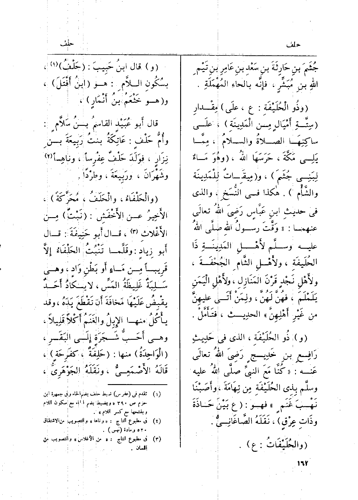 والحُلَيْفَاتُ: ع. وَقَالَ ابنُ حَبِيبَ: حَلْفُ، بسُكُونِ اللاَّمِ: هُوَ ابنُ أَفْتَلَ، وَهُوَ خَثْعَمُ بنُ أَنْمَارٍ، قَالَ) أَبو عُبَيْدٍ القاسمُ بنُ سَلاَّمٍ: وأُمُّ حَلْفٍ: عَاتِكَةُ بنتُ رَبِيعَةَ بنِ نِزَارٍ: فوَلَدَ حَلْفٌ عِفْرِساً، وناهِساً وشَهْرَانَ، ورَبِيعَةَ، وطرْداً.
