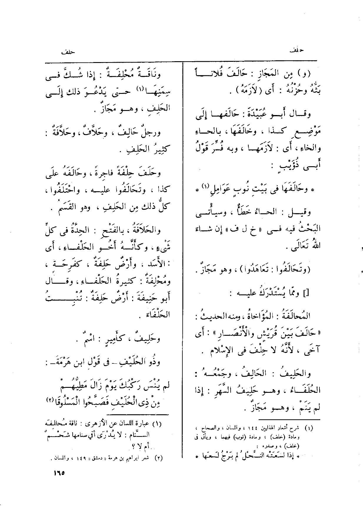 ومِن المَجَازِ: حَالَفَهُ على ذَلِك مُحَالَفَةً وحِلافاً: أَي عَاهَدَهُ، وَهُوَ حِلْفُه، وحَلِيفُه. ومِن المَجَازِ: حَالَفَ فُلاناً بَثُّهُ وحُزْنُهُ: أَي لاَزَمَهُ. وَقَالَ أَبو عُبَيْدَةَ: حَالَفها إِلَى مَوْضِع كَذَا، وخَالَفَهَا، بالحاءِ والخاءِ، أَي: لاَزَمَها، وَبِه فُسِّرَ قَوْلُ أَبي ذُؤَيْبٍ: وحَالَفَهَا فِي بَيْتِ نُوبٍ عَوَامِلِ وَقيل: الحاؤُ خَطَأٌ، وسيأْتي البَحْثُ فِيهِ فِي خَ ل ف إِن شاءَ اللهُ تَعَالَى. وتَحَالَفُوا: تَعَاهَدُوا، وَهُوَ مَجَازٌ. وممّا يُسْتَدْرَكُ عَلَيْهِ: المُحالَفَةُ: المُؤَاخاةُ، وَمِنْه الحديثُ: حَالَفَ بَيْنَ قُرَيْشٍ والأَنْصَارِ: أَي آخَى، لأَنَّهُ لَا حِلْفَ فِي الإِسْلام. والحَلِيفُ: الحَالِفُ، وجَمْعُهُ: الحُلَفَاءُ، وَهُوَ حَلِيفُ السَّهَرِ: إِذا لم يَنَمْ، وَهُوَ مَجَازٌ.