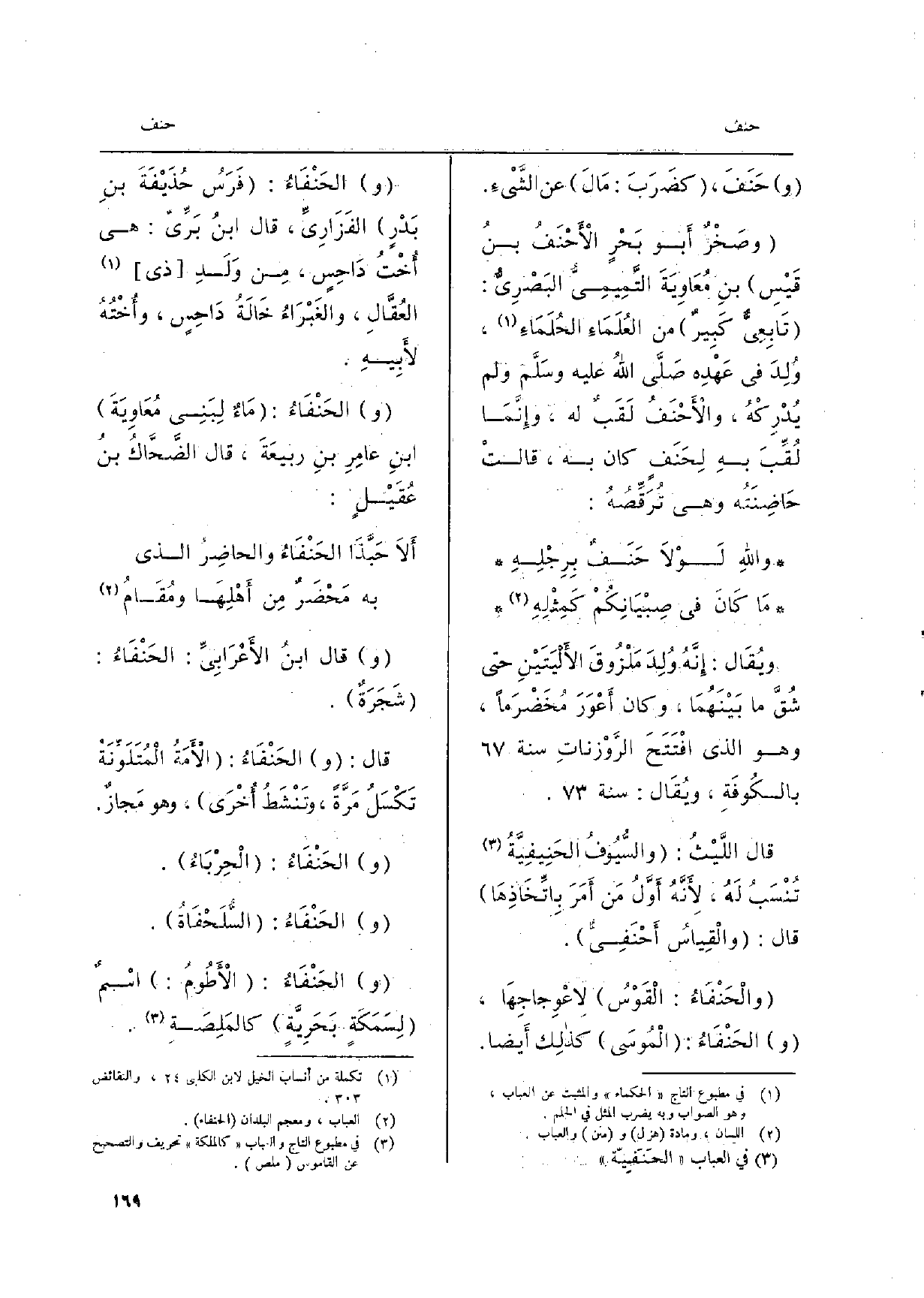 وحَنَفَ، كضَرَبَ: مَالَ عَن الشَّيْءِ. وصَخْرٌ أَبو بَحْرٍ الأَحْنَفُ بنُ قَيْسِ بنِ مُعَاوِيَةَ التَّمِيمِيُّ البَصْرِيُّ: تَابِعِيٌّ كَبِيرٌ من العُلَمَاءِ الحُلَمَاءِ، وُلِدَ فِي عَهْدِه صلَّى اللهُ عَلَيهِ وسَلَّمَ وَلم يُدْرِكْهُ، والأَحْنَفُ لَقَبٌ لَهُ، وإِنَّمَا لُقِّبَ بنِ لِحَنَفٍ كَانَ بِهِ، قالتْ حَاضِنَتُه وَهِي تُرَقِّصُهُ: واللهِ لَوْلاَ حَنَفٌ بِرِجْلِهِ مَا كَانَ فِي صِبْيَانِكُمْ كَمِثْلِهِ ويُقَال: إِنَّهُ وُلِدَ مَلْزُوقَ الأَلْيَتَيْنِ حَتَّى شُقَّ مَا بَيْنَهُمَا، وَكَانَ أَعْوَرَ مُخَضْرَماً، وَهُوَ الَّذِي افْتَتَحَ الرَّوْزناتِ سنة بالكُوفَةِ، ويُقَال: سنة.