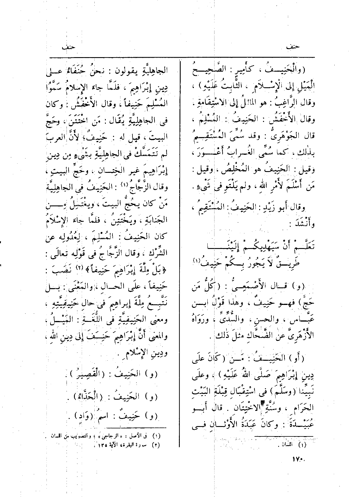 وَقَالَ الأَصْمَعِيُّ: كُلُّ مَن حَجَّ فَهُوَ حَنِيفٌ، وَهَذَا قَوْلُ ابْن عَبَّاس، والحسنِ، والسُّدِّيِّ، ورَوَاهُ الأَزْهَرِيَّ عَن الضَّحَّاحِ مثلَ ذَلِك. أَو الحَنِيفُ: مَن كَانَ علَى دِينِ إِبْرَاهِيمَ صَلَّ اللهُ عَلَيْهِ، وعلَى نَبِيِّنا وسَلَّمَ فِي اسْتِقْبَالِ قِبْلَةِ البَيْتِ الحَرَامِ، وسُنَّةِ الاخْتِتَانِ. قَالَ أَبو عُبَيْدَةَ: وكانَ عَبَدَةُ الأَوْثَانِ فِي الجاهِليَّةِ يَقُولُونَ: نحنُ حُنَفَاءُ على دِينِ إِبْرَاهِيمَ، فلَّمَّا جاءَ الإِسلامُ سَمَّوُا المُسْلِمَ حَنِيفاً، وَقَالَ الأَخْفَشُ: وَكَانَ فِي الجاهِلِيَّةِ يُقَال: مَن اخْتَتَنَ، وحَجَّ البيتَ، قيل لَهُ: حَنِيفٌ، لأَنَّ العربَ لم تَتَمَسَّكْ فِي الجاهِلِيَّةِ بشَيْءٍ مِن دِينِ إِبْرَاهِيمَ غير الخِتانِ، وحَجِّ البيتِ، وَقَالَ الزَّجَّاجُ: الحَنِيفُ فِي الجاهِلِيَّة مَنْ كَانَ يحُجُّ البيتَ، ويغْتَسِلُ مِن الجَنابَةِ، ويَخْتَتِنُ، فلمَّا جاءَ الإِسْلاَمُ كَانَ الحَنِيفُ: المُسْلِمَ، لِعُدُولِه عَن الشِّرْكِ، وَقَالَ الزَّجَّاجُ فِي قَوْلِه تعالَى: بَلْ مِلَّةَ إِبْرَاهِيمَ حَنِيفاً نَصَبَ: حَنِيفاً، علَى الحالِ، والمَعْنَى: بل نَتَّبِعُ مِلَّةَ إِبراهِيمَ فِي حالِ حَنِيفِيَّتِهِ، وَمعنى الحَنِفِيَّةِ فِي اللُّغَةِ: المَيْلُ، وَالْمعْنَى أَنَّ إِبْرَاهِيمَ حَنِفَ إِلى دِينِ اللهِ، ودِينِ الإِسْلامِ.