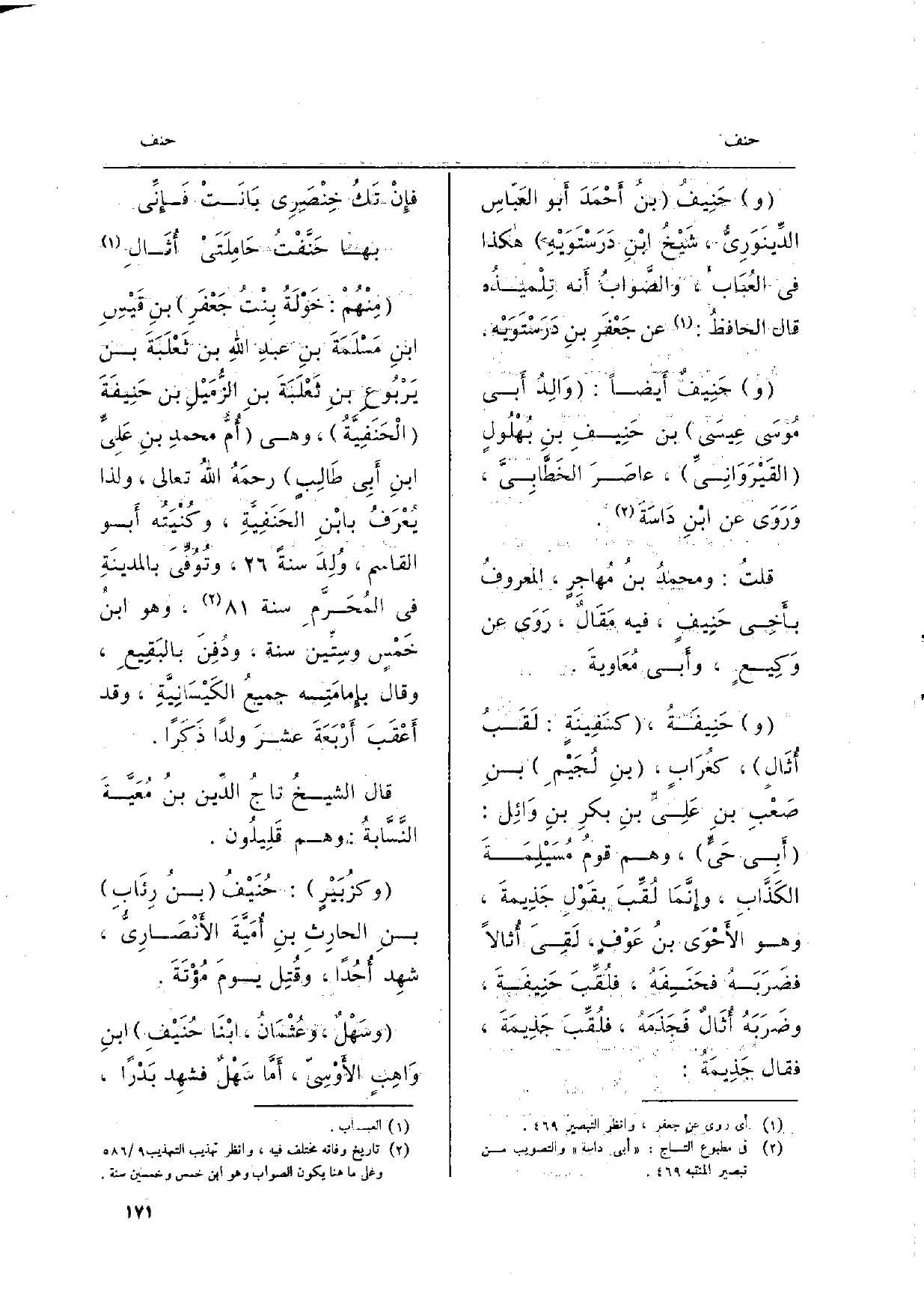 وحَنِيفَةُ، كسَفِينَةٍ: لَقَبُ أُثَالٍ، كغُرَابٍ، بنِ لُجَيْمِ بنِ صَعْبِ بنِ عَلِيٍّ بنِ بكرِ بنِ وَائِل: أَبِي حَيٍّ، وهم قومُ مُسَيْلِمَةَ الكَذَّابِ، وإِنَّمَا لُقِّبَ بقَوْلِ جَذِيمةَ، وَهُوَ الأَحْوَى بنُ عَوْفٍ، لَقِي أُثالاً فضَرَبَهُ)