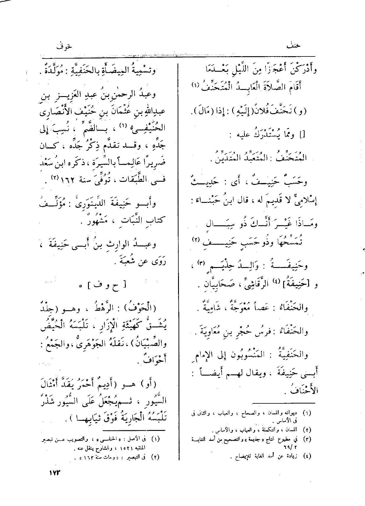 وتَحَنَّفَ فُلانٌ إِلَيْهِ: إِذا مَالَ. ومّما يُسْتَدْرَكُ عَلَيْهِ: وحَسَبٌ حَنِيفٌ، أَي: حَدِيثٌ إِسْلامِيٌّ لَا قَدِيمَ لَهُ، قَالَ ابنُ حَبْناءَ: