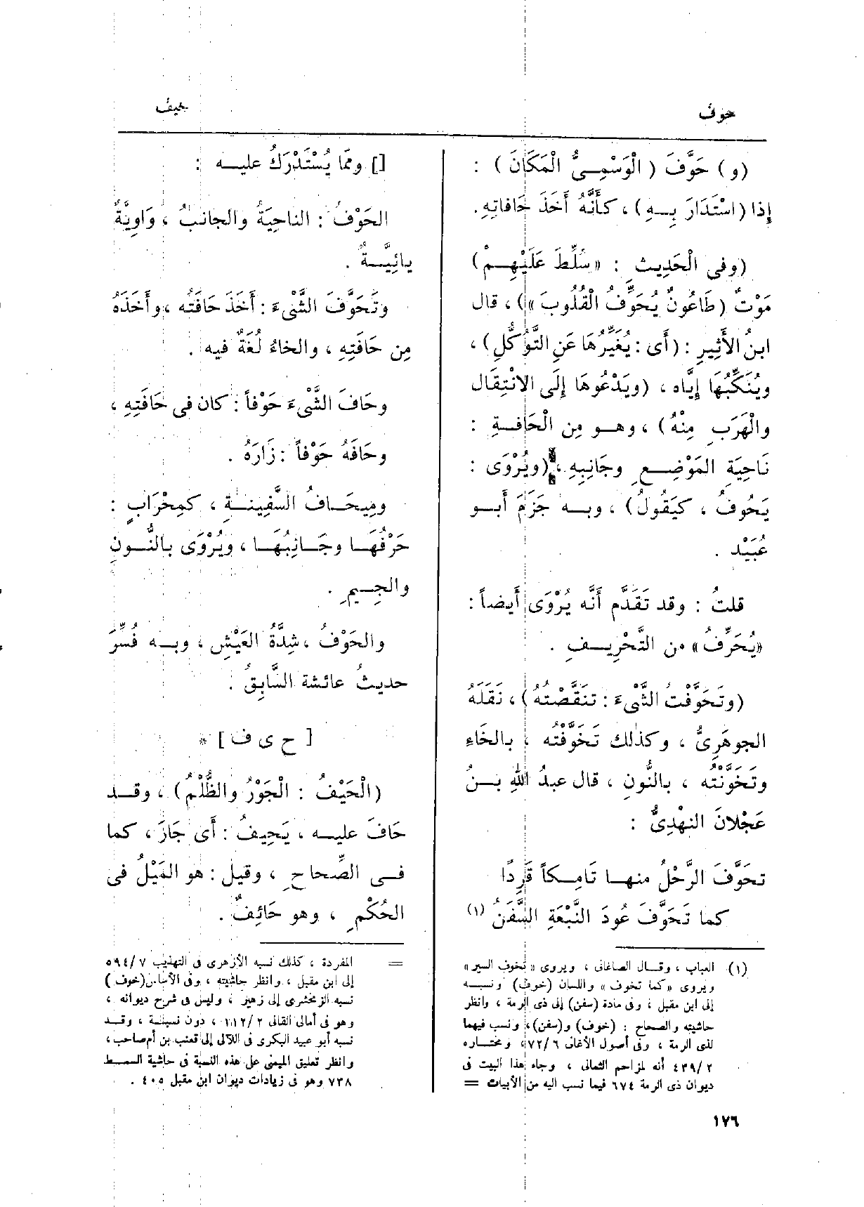 قلتُ: قد تَقَدَّم أَنَّه يُرْوَى أَيضاً: يُحَرِّفُ من التَّحْرِيفِ. {وتَحوَّفْتُ الشَّيْءَ: تنَقَّصْتُهُ، نَقَلَهُ الجوهَرِيُّ، وَكَذَلِكَ تَخَوَّفْتُه، بالخَاءِ وتَخَوَّنْتُه، بالنُّونِ، قَالَ عبدُ اللهِ بنُ عَجْلانَ النهْدِيُّ: