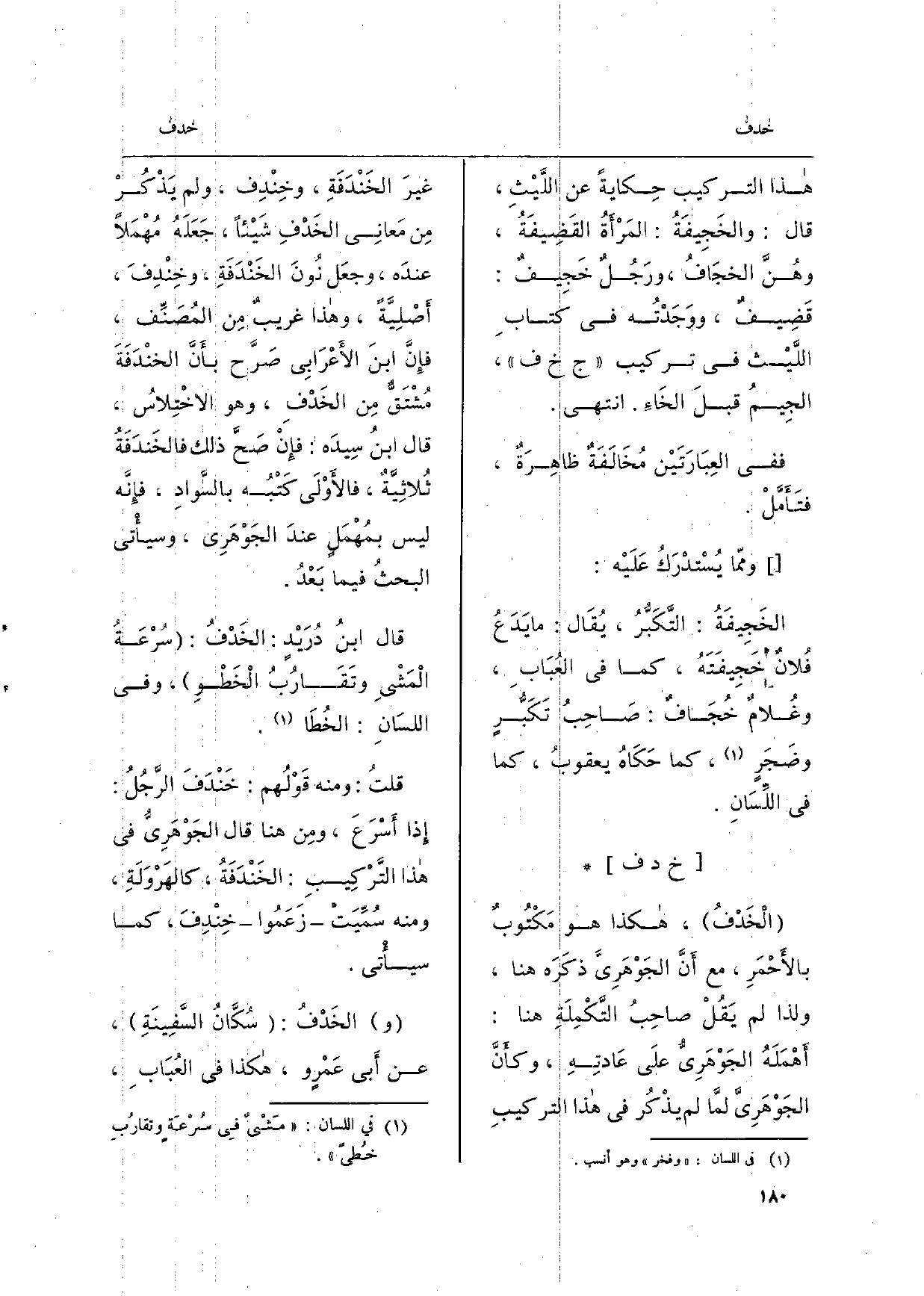 ) الْخَدْفُ، هَكَذَا هُوَ مَكْتُوبٌ بالأَحْمَرِ، مَعَ أَنَّ الجَوْهَرِيَّ ذكَرَه هُنَا، وَلذَا لم يَقُلْ صاحِبُ التَّكْمِلَةِ هُنَا: أَهْمَلَهُ الجَوْهَرِيُّ علَى عَادتِهِ، وكأَنَّ الجَوْهَرِيَّ لمَّا لم يذْكُر فِي هَذَا التركيبِ غيرَ الخَنْدَفَةِ، وخِنْدِف، وَلم يَذْكُرْ مِن مَعانِي الخَدْفِ شَيْئاً، جَعَلَهُ مُهْمَلاً عندَه، وجعَل نُونَ الخَنْدَفَةِ، وخِنْدِفَ، أَصْلِيَّةً، وَهَذَا غريبٌ مِن المُصَنِّف، فإِنَّ ابنَ الأَعْرَابِي صَرَّح بأَنَّ الخنْدَفَةَ مُشْتَقٌّ مِن الخَدْفِ، وَهُوَ الاخْتِلاسُ، قَالَ ابنُ سِيدَه: فإِنْ صَحَّ ذَلِك فالخَندَفَةُ ثُلاثِيَّةٌ، فالأَوْلَى كَتْبُه بالسَّوادِ، فإِنَّه لَيْسَ بمُهْمَلٍ عندَ الجَوْهَرِي، وسيأْتي البحثُ فِيمَا بَعْدُ.