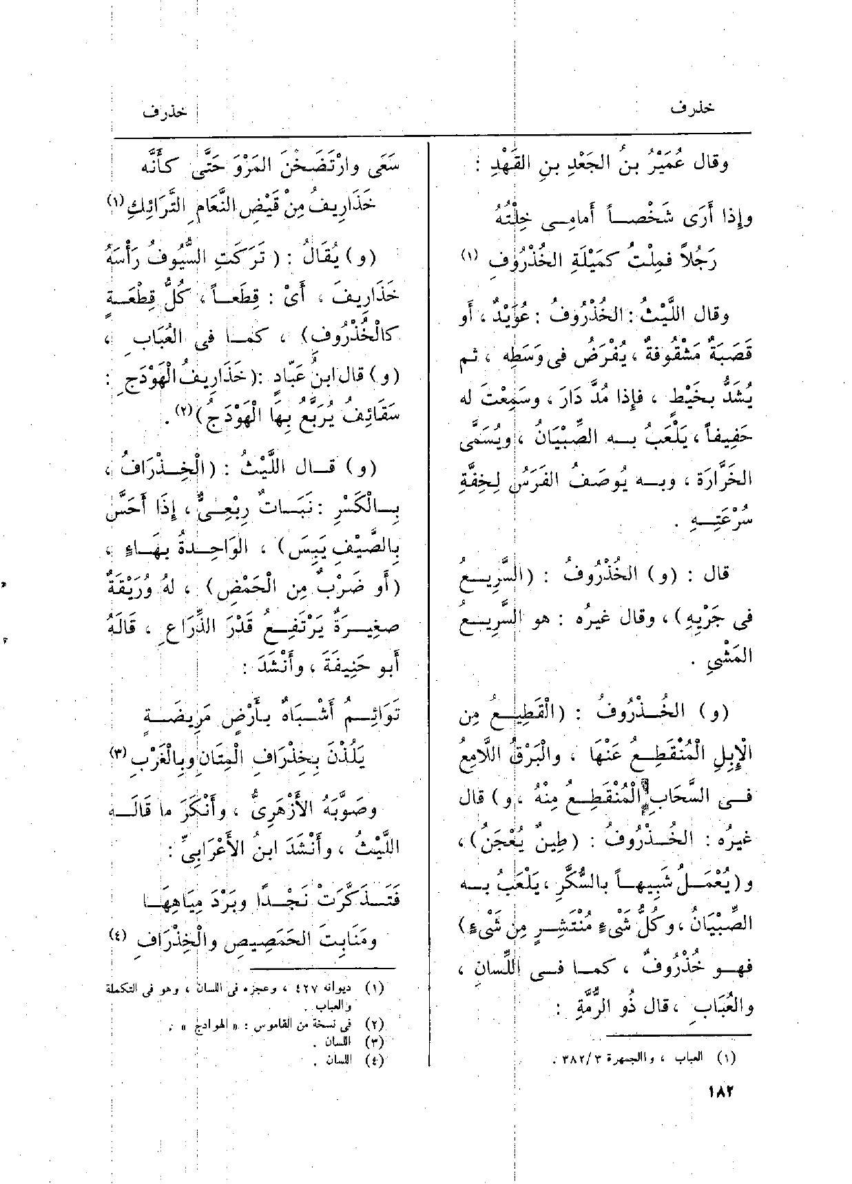 وَقَالَ اللَّيْثُ: الْخِذْرَافُ، بِالْكَسْرِ: نَبَاتٌ رِبْعِيٌّ، إِذَا أَحَسَّ بِالصَّيْفِ يَبِسَ، الوَاحِدةُ بهَاءٍ، أَو ضَرْبٌ مِن الْحَمْضِ، لهُ وُرَيْقَةٌ صغِيرةٌ يَرْتَفِعُ قَدْرَ الذِّرَاعِ، قَالَهُ أَبو حَنِيفَةَ، وأَنْشَدَ:
