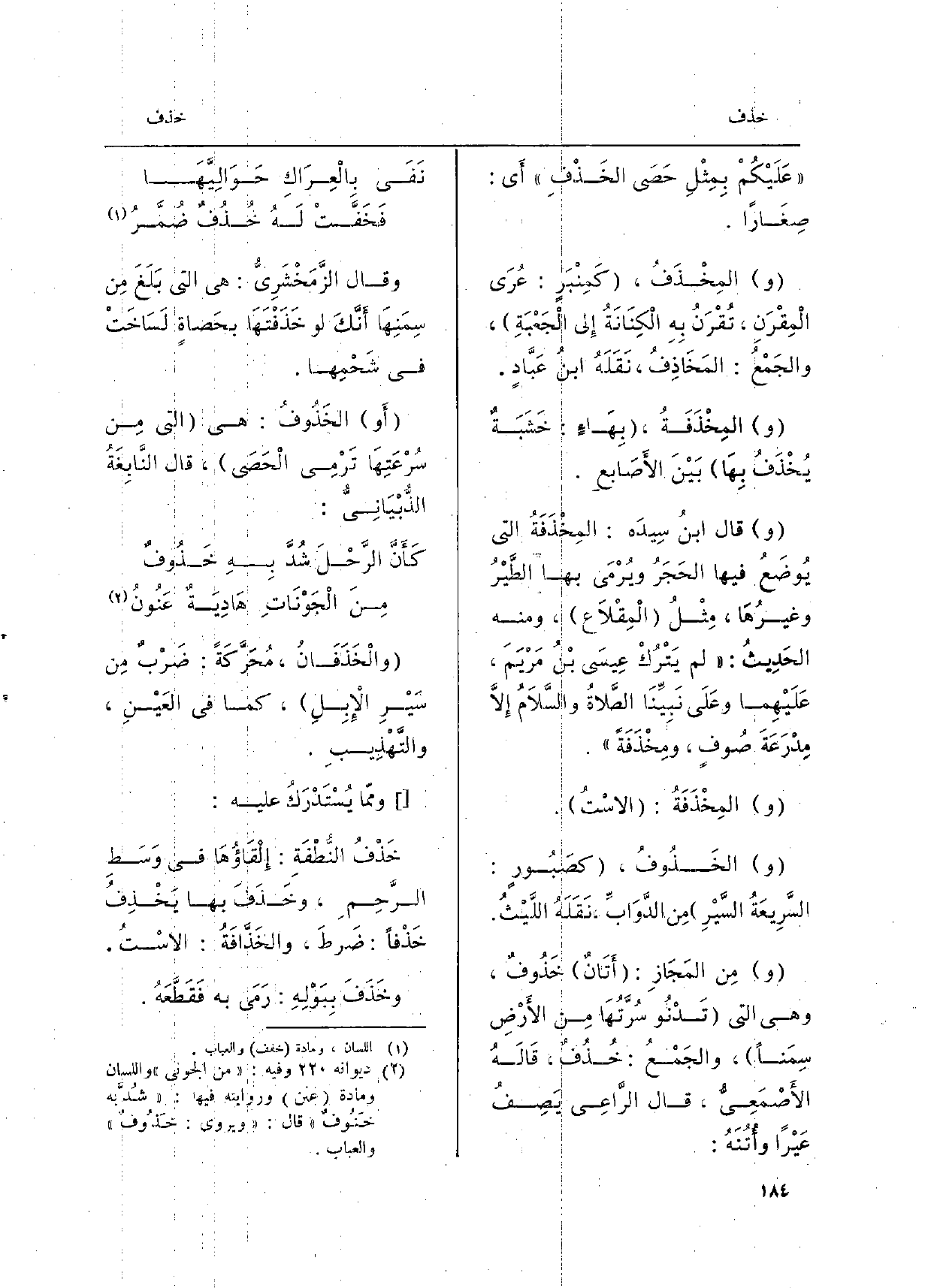 وَقَالَ الزَّمَخْشَرِيُّ: هِيَ الَّتِي بَلَغَ مِن سِمَنِهَا أَنَّكَ لَو خَذَفْتَهَا بحَصاةٍ لَسَاخَتْ فِي شَحْمِها. أَو الخَذُوفُ: هِيَ الَّتِي مِن سُرْعَتِهَا تَرْمِي الْحَصَى، قَالَ النَّابِغَةُ الذُّبْيَانِيُّ: