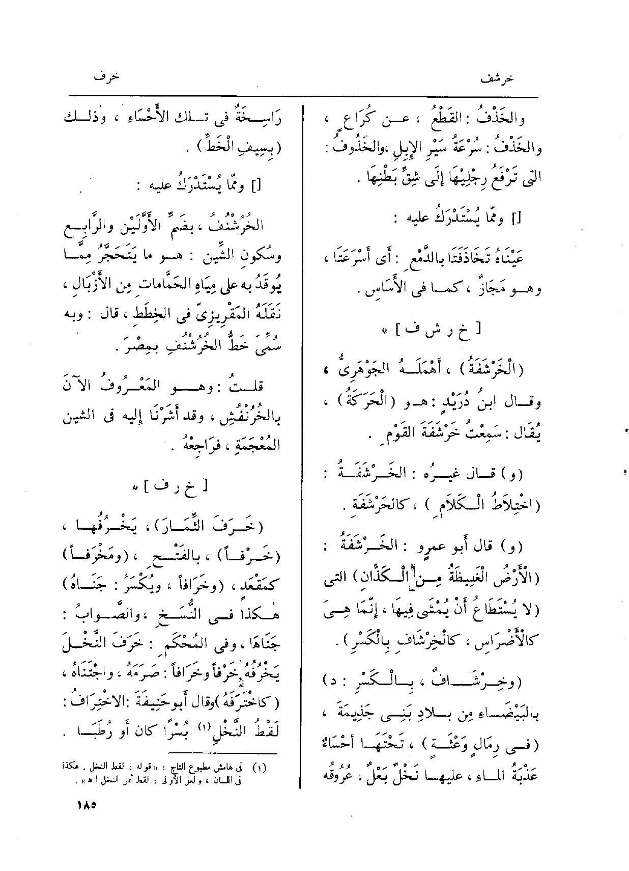 ومّما يُسْتَدْرَكُ عَلَيْهِ: الخُرُشْنُفُ، بضَمِّ الأَوَّلَيْن والرَّابِع وسُكونِ الشِّين: هُوَ مَا يَتَحَجَّرُ مِمَّا يُوقَدُ بِهِ على مِيَاهِ الحَمَّاماتِ مِن الأَزْبَالِ، نَقَلَهُ المَقْرِيزِيّ فِي الخِطَطِ، قَالَ: وَبِه سُمِّيَ خَطُّ الخُرُشْنُفِ بمِصْرَ. قلتُ: وَهُوَ المَعْرُوفُ الآنَ بالخُرُنْفُشِ، وَقد أَشَرْنَا إِليه فِي الشين المُعْجَمَةِ، فرَاجِعْهُ. 3 (