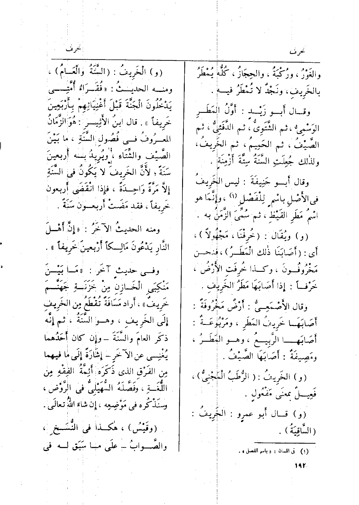 وَمِنْه الحديثُ الآخَرُ: إِنَّ أَهْلَ النَّارِ يَدْعُونَ مَالِكاً أَرْبعينَ خَرِيفاً. وَفِي حديثٍ آخَر: مَا بَيْنَ مَنْكِبَيِ الْخَازِنِ مِنْ خَزَنَةِ جَهَنَّمَ خَرِيفٌ، أَراد مَسَافَةً تُقْطَعُ مِن الخَرِيفِ إِلَى الخَرِيفِ، وَهُوَ السَّنَةُ، ثمَّ إِنَّه ذكَر العامَ والسَّنَةَ وإِن كَانَ أَحَدُهما يُغْنِي عَن الآخَرِ إِشَارَةً إِلَى مَا فيهمَا مِن الفَرْقِ الَّذِي ذَكَرَه أَئِمَّةُ الفِقْهِ مِن اللُّغَةِ، الَّذِي ذَكَرَه أَئِمَّةُ الفِقْهِ مِن اللُّغَةِ، وفَصَّلَهُ السُّهَيْلِيُّ فِي الرَّوْض، وسَنذْكُره فِي مَوْضِعِه، إِن شاءَ اللهُ تعالَى. وقَيْسُ، هَكَذَا فِي النُّسَخِ، والصَّوابُ علَى مَا سَبَق لَهُ فِي
